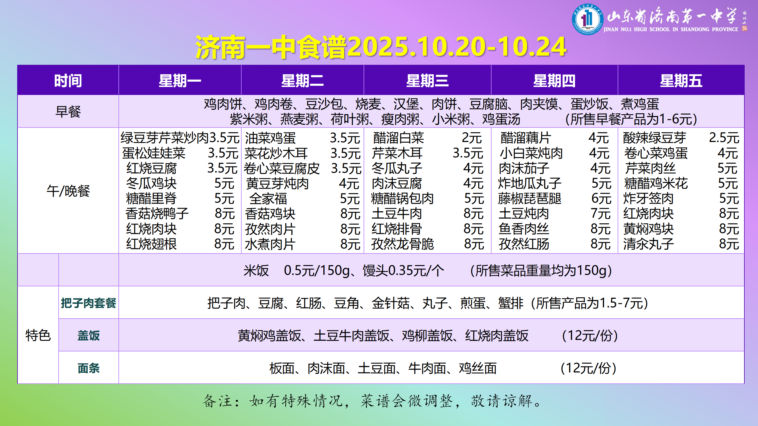 济南一中食谱2025.10.20-10.24
