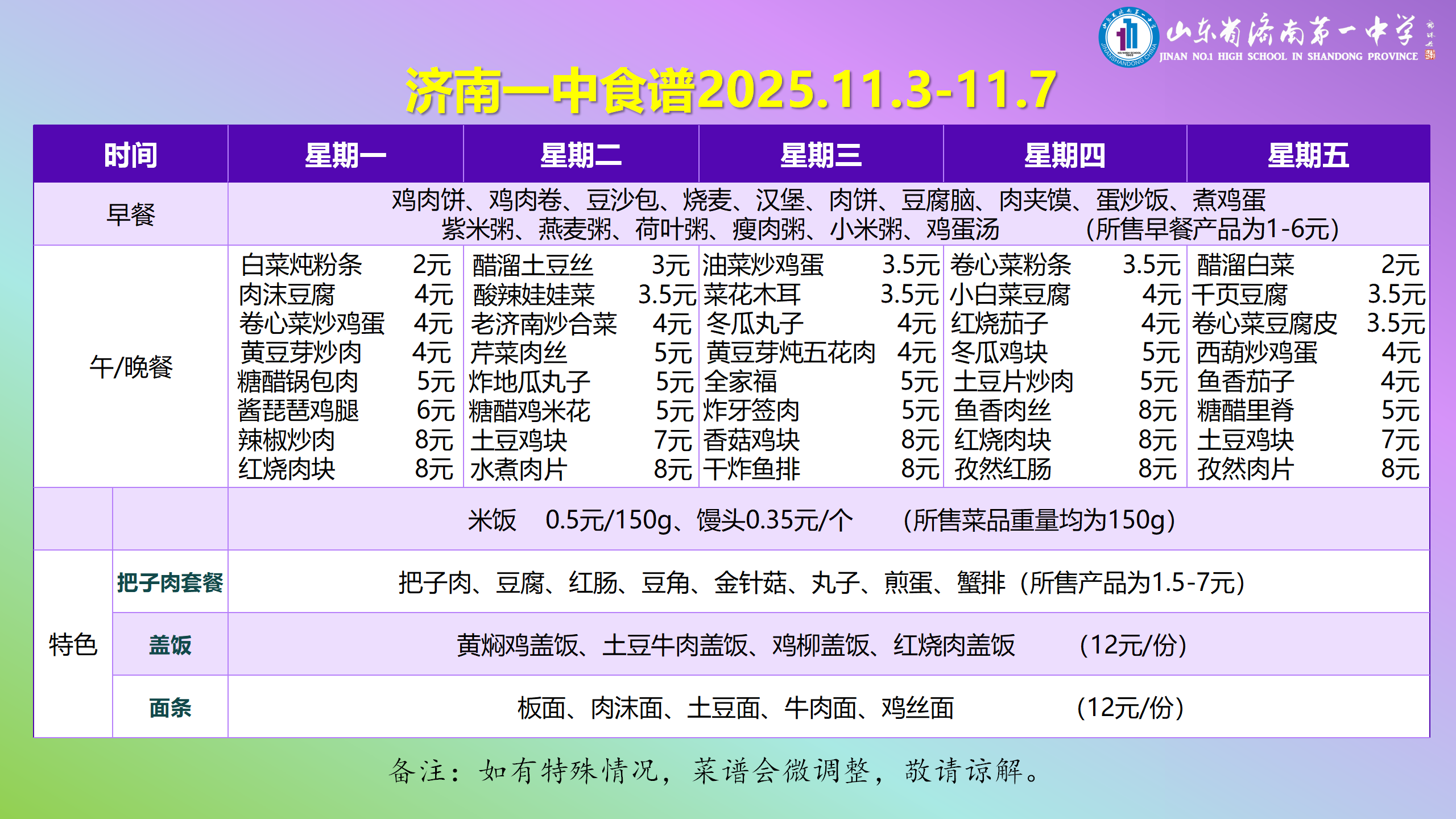 济南一中食谱2025.11.3-11.7