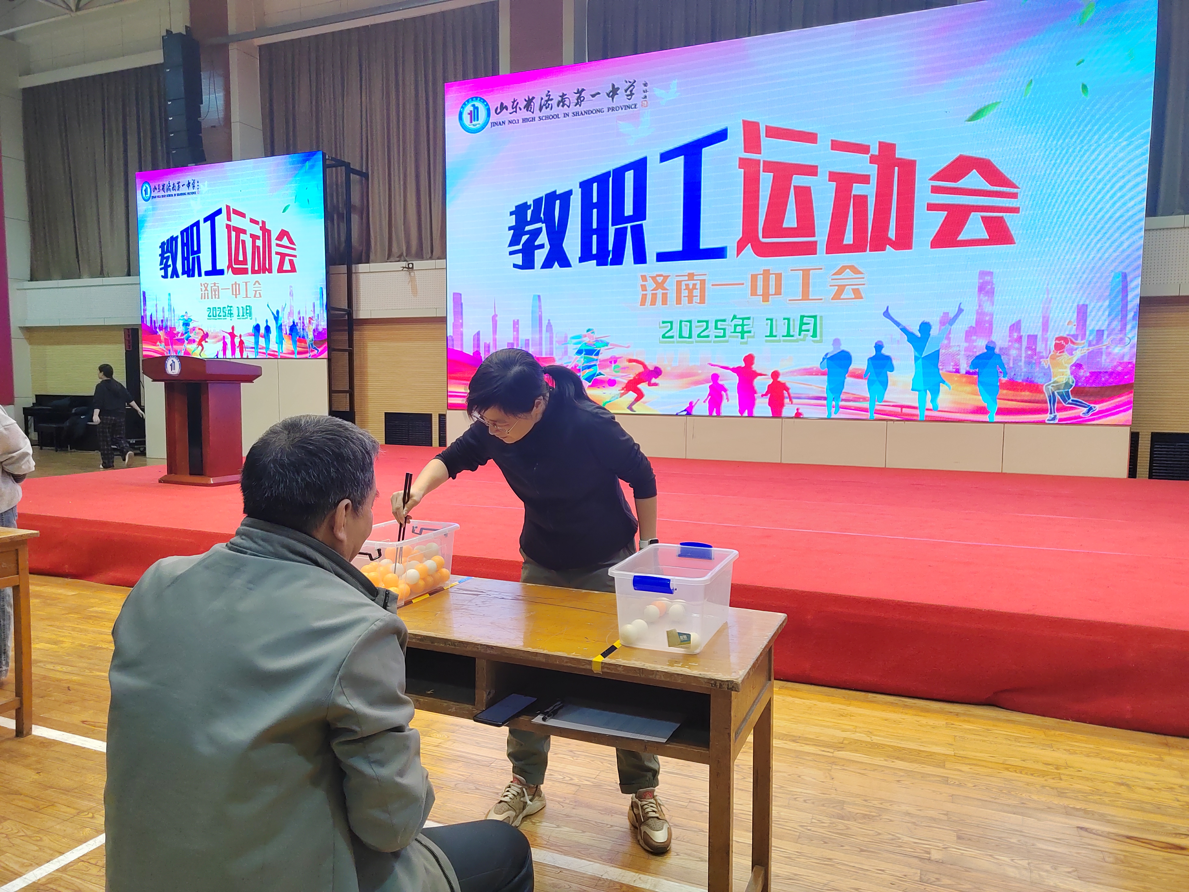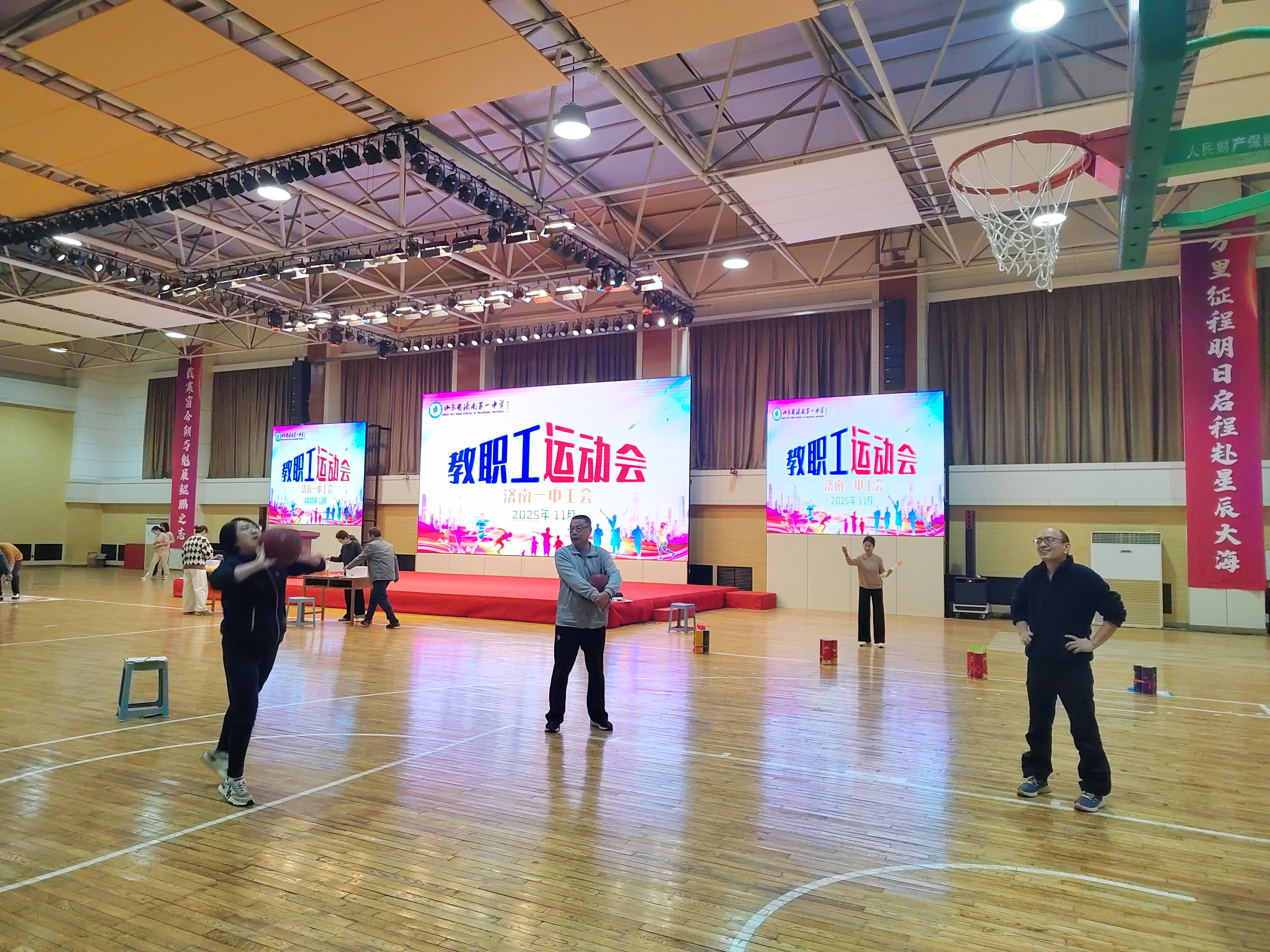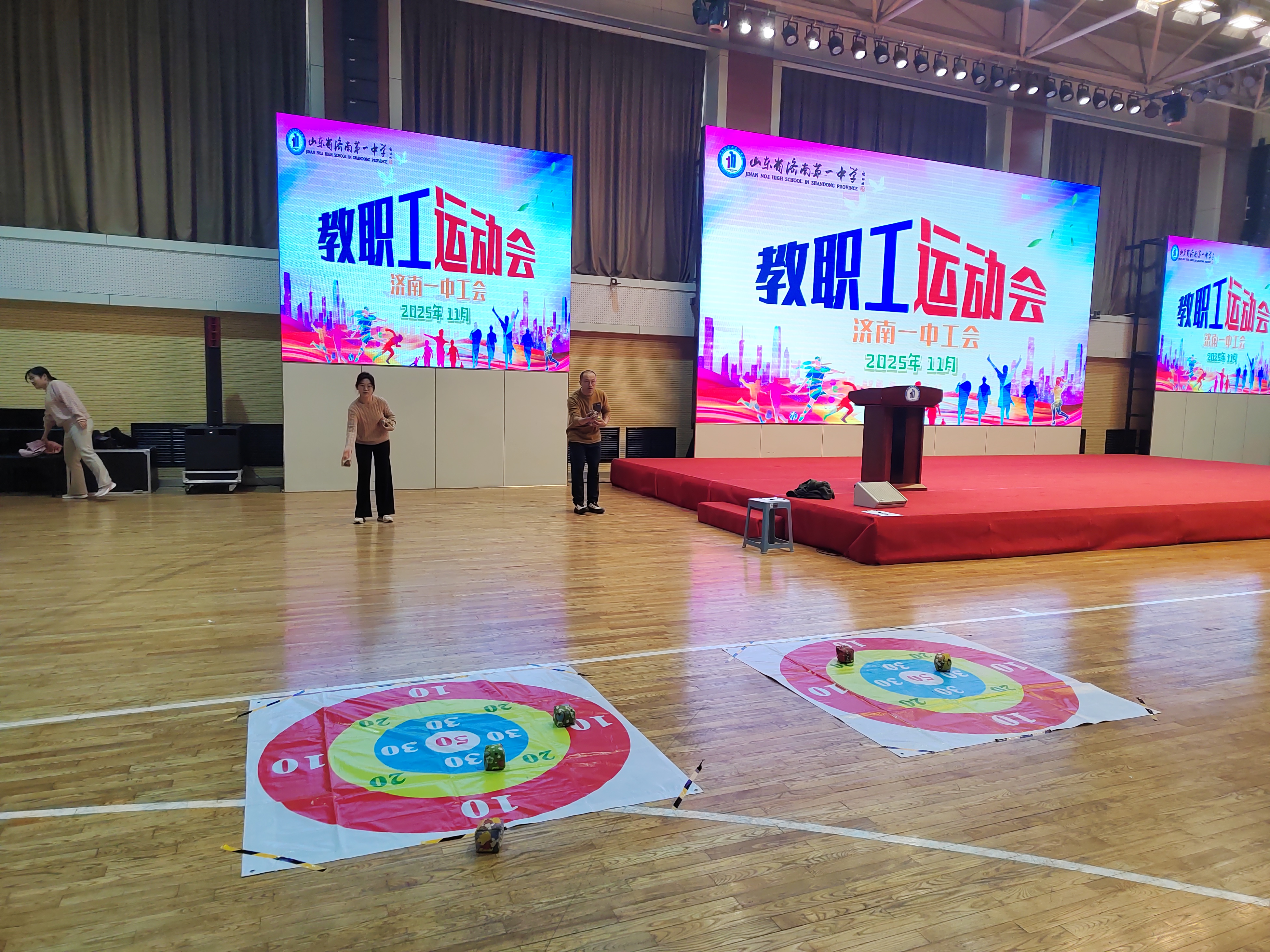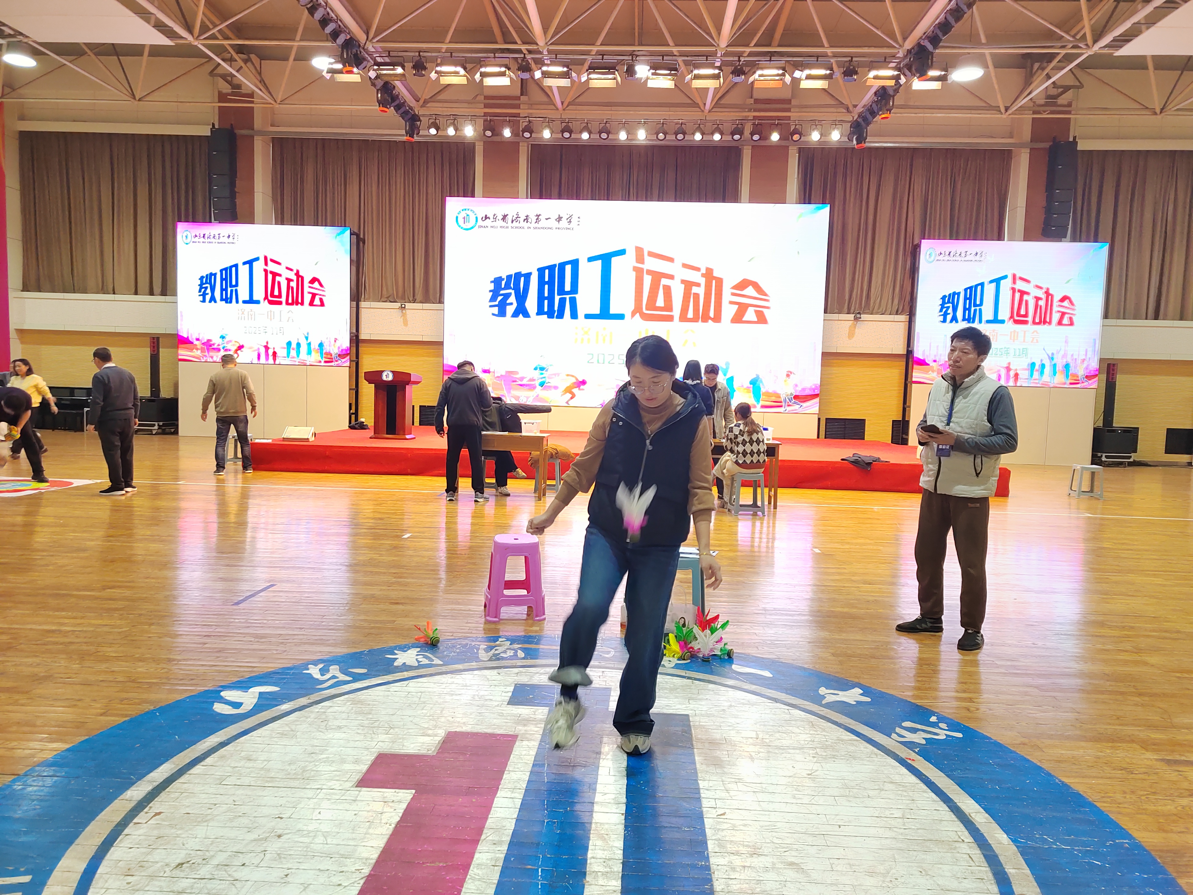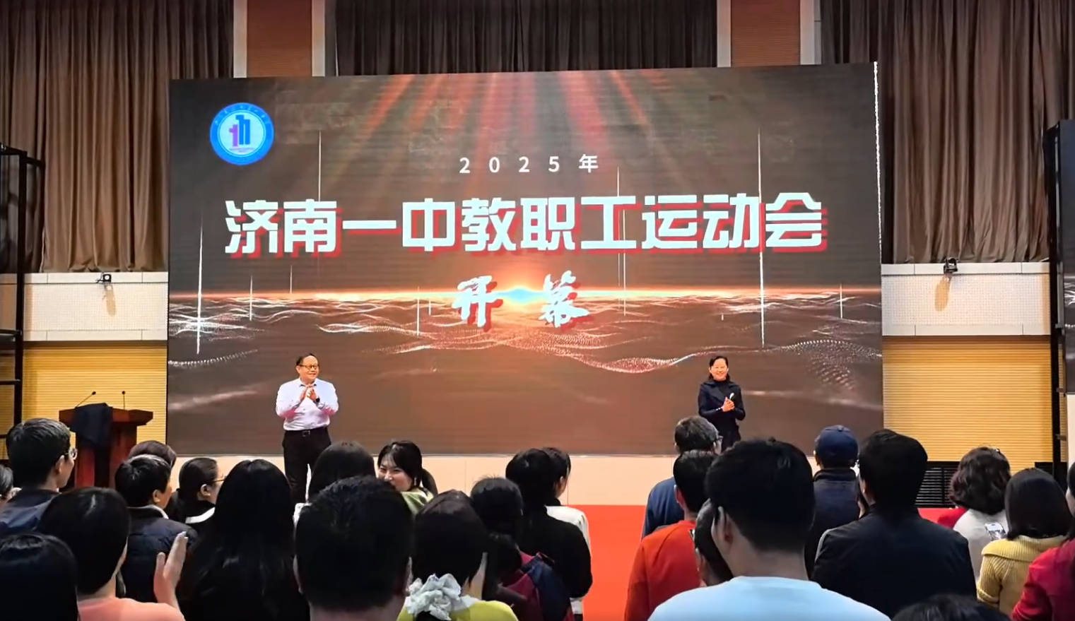 近日,济南一中举行2025年教职工运动会。校长苗翠强,党委书记郑玉香共同按下启动按钮,拉开了运动会序幕,学校工会隋顺东主席主持开幕仪式。
