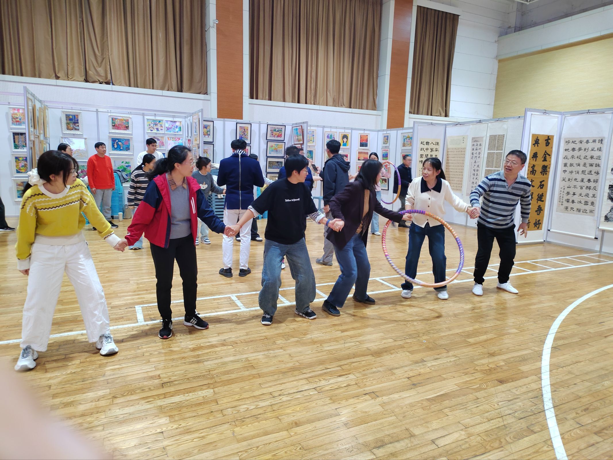 集体项目精彩不断。“珠行万里”中,6名队员手持U型接力槽精准交替接球,紧张感拉满;“绕8字跳绳”赛场,队员依次按“8”字路线穿梭跳跃,成功跃迁便引得场边欢呼喝彩;“一圈到底”项目里,队员手拉手,靠身体转动传递呼啦圈,尽显团队凝聚力;“纵横天下”项目,四组队员手拉细绳搭建“井”字形轨道,彰显拼搏精神。