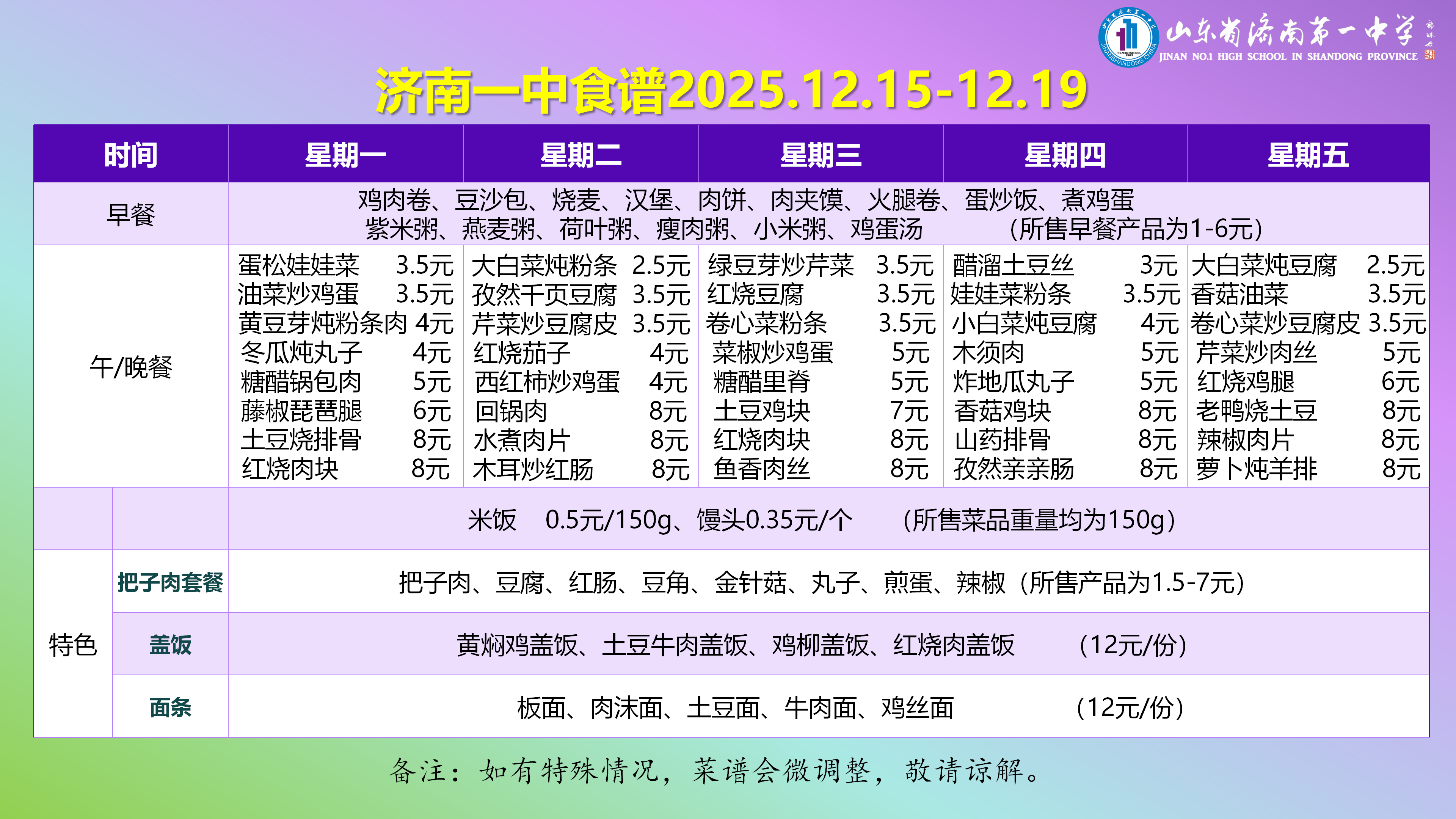 济南一中食谱2025.12.15-12.19