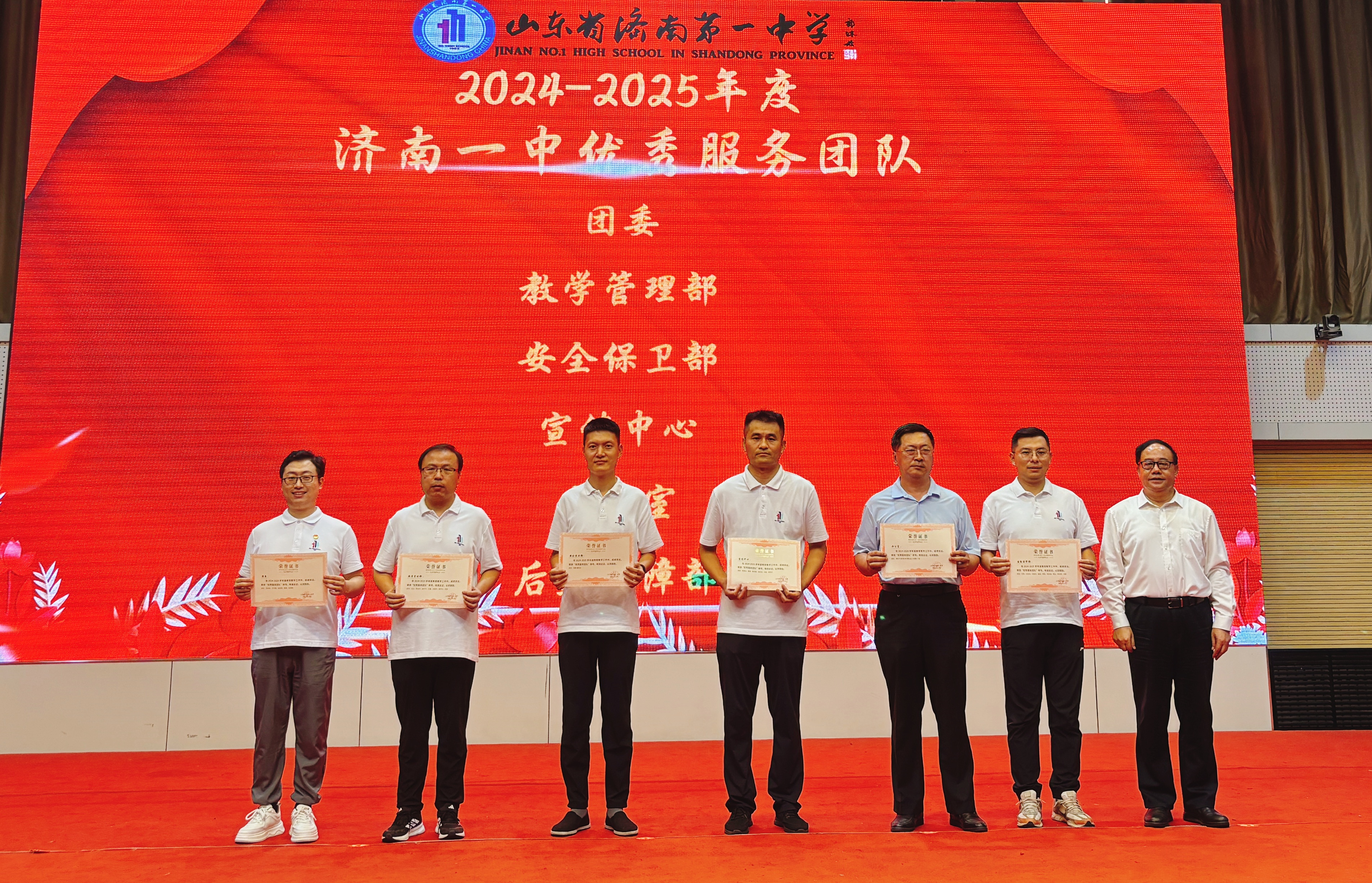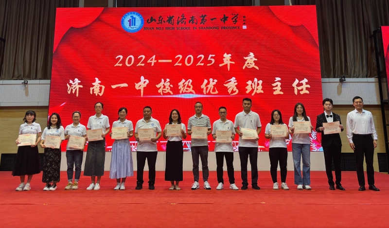副校长高万福宣读《济南一中2024-2025学年度表彰决定》,学校领导依次为“优秀服务团队”“优秀教学团队”“教学先进个人”“校级优秀班主任”及“校长特别贡献奖”的获奖集体和个人颁发荣誉证书。