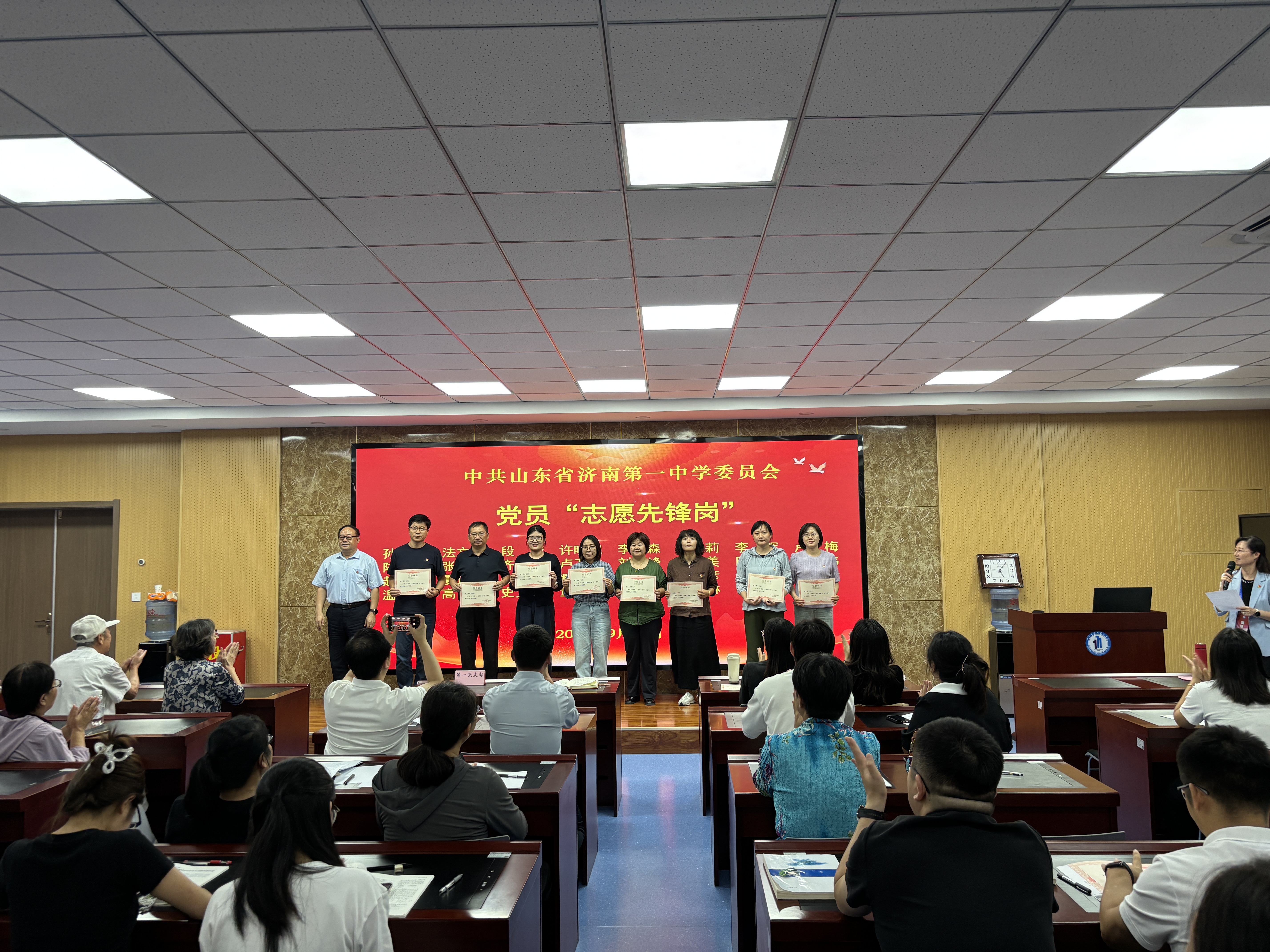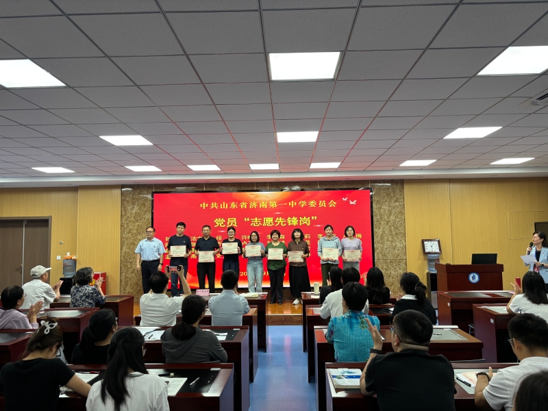 9月17日下午,济南一中党委在格物楼四楼道德讲堂举行“党员先锋岗”表彰仪式,党委书记郑玉香主持。