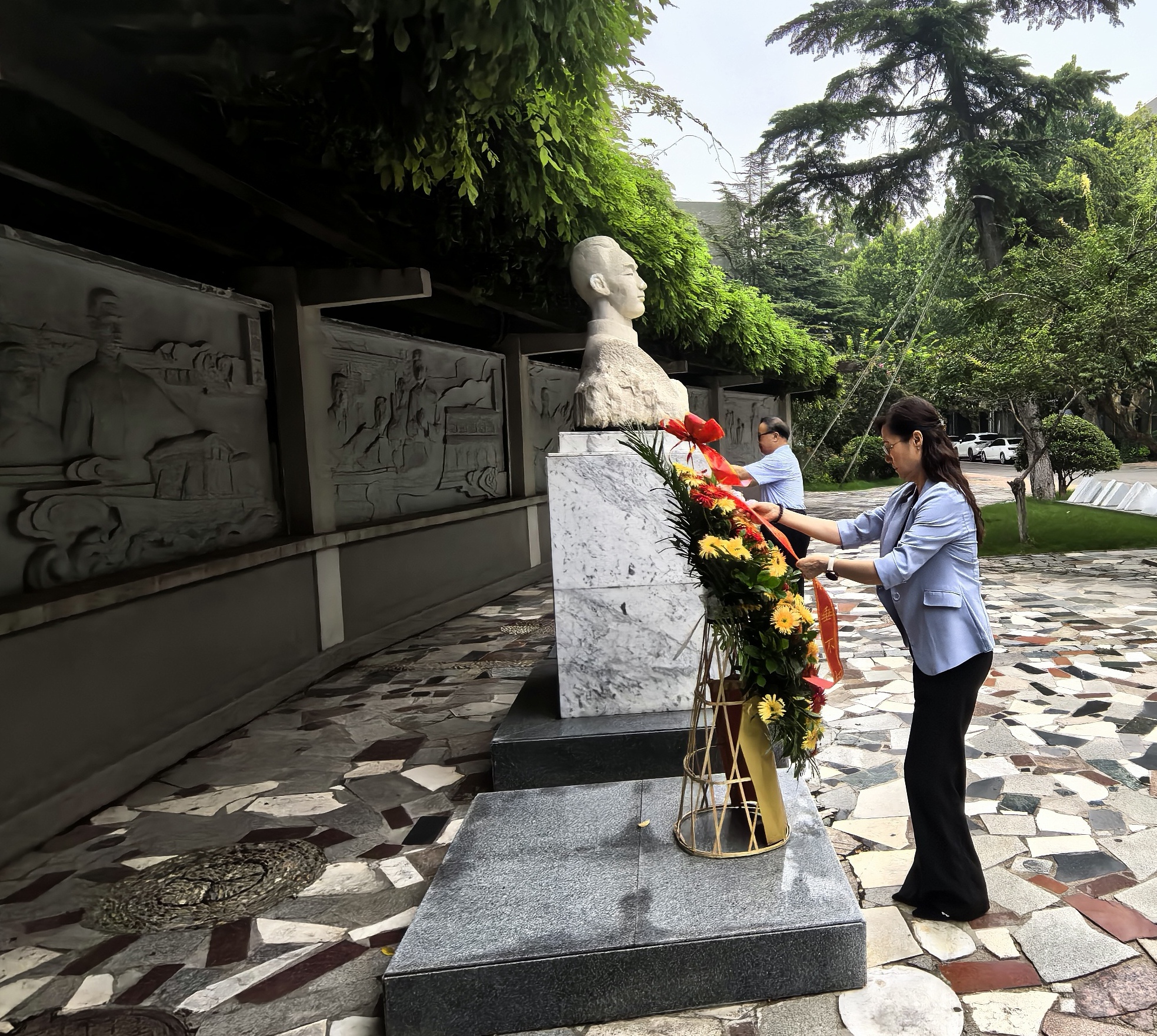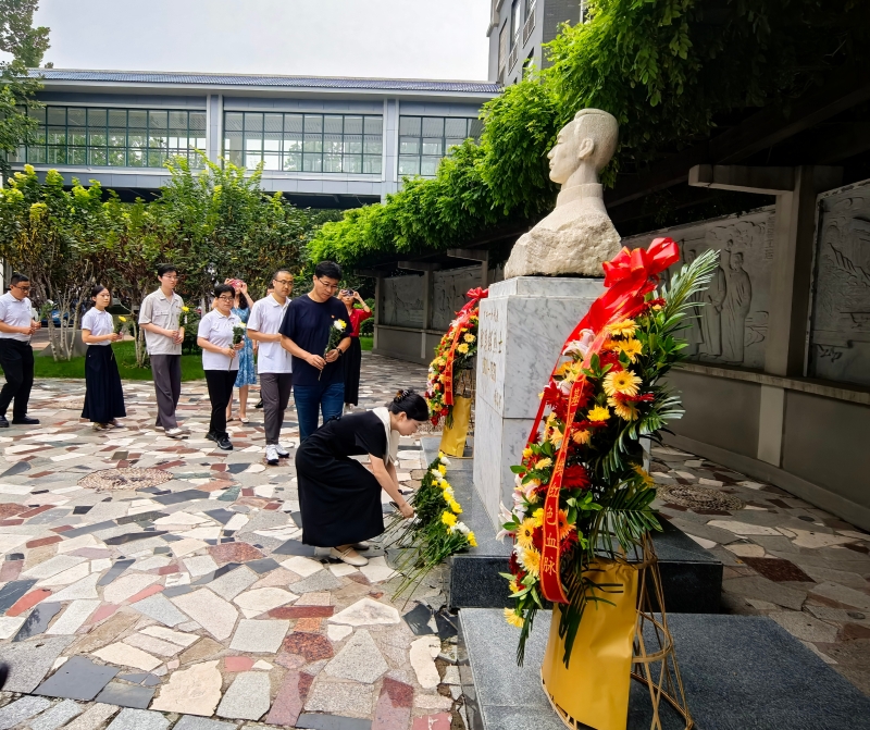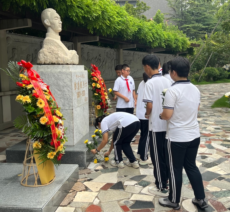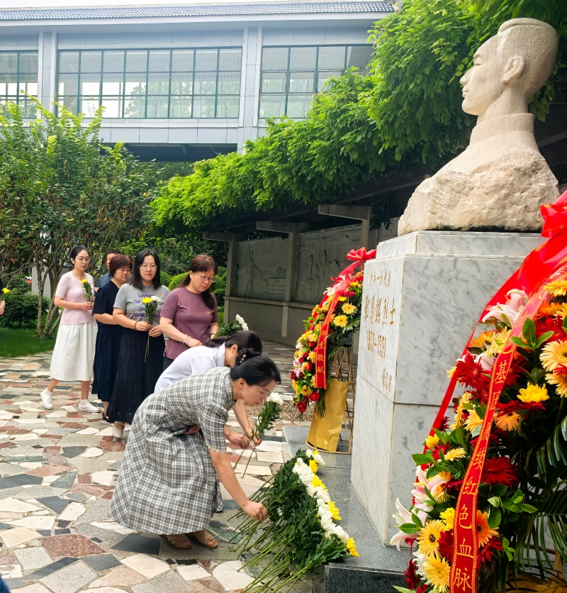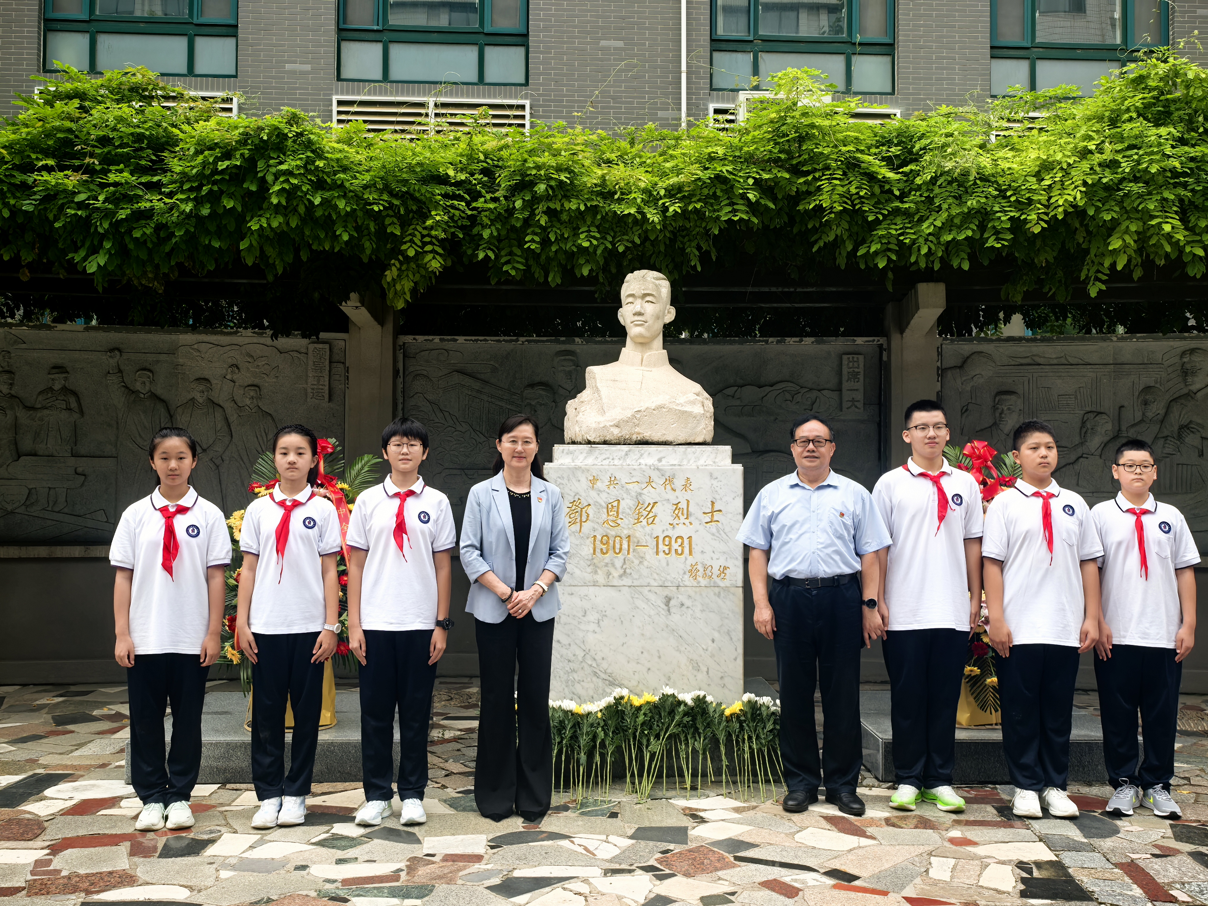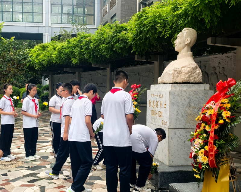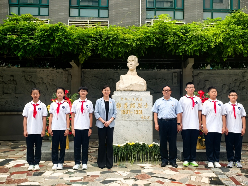 活动伊始,校长苗翠强,党委书记郑玉香代表全校党员师生向邓恩铭烈士塑像敬献花篮。随后,少先队员、共青团员和党员依次上前献花,60支鲜花与2个花篮寄托了师生对革命先烈的深切哀思和崇高敬意。献花仪式后,全体人员肃立默哀一分钟,在庄严肃穆的氛围中追忆先烈英勇事迹,感悟崇高革命精神。