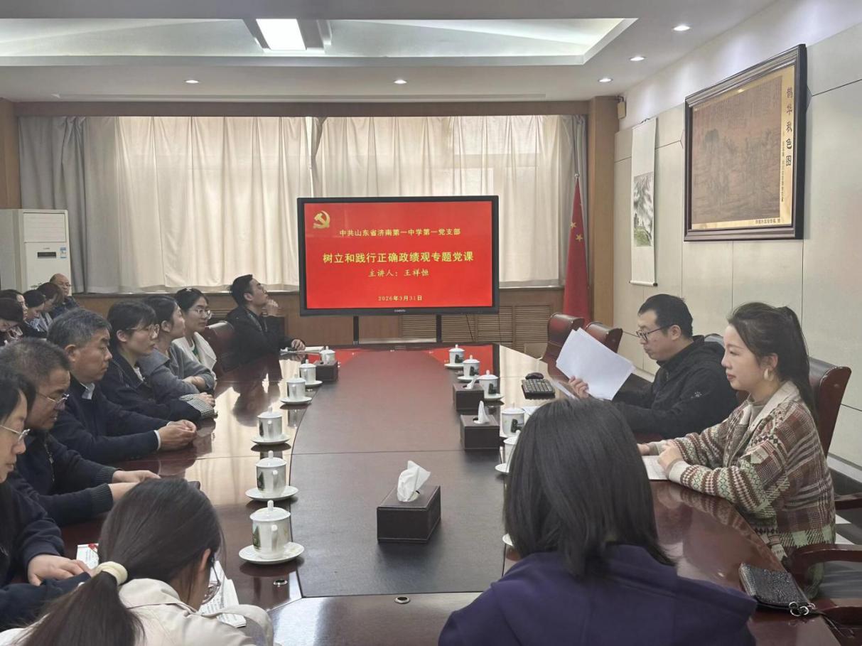 近日,济南一中第一党支部书记王祥恒在弘德楼一楼会议室为党支部全体党员上专题党课,扎实开展树立和践行正确政绩观学习教育。