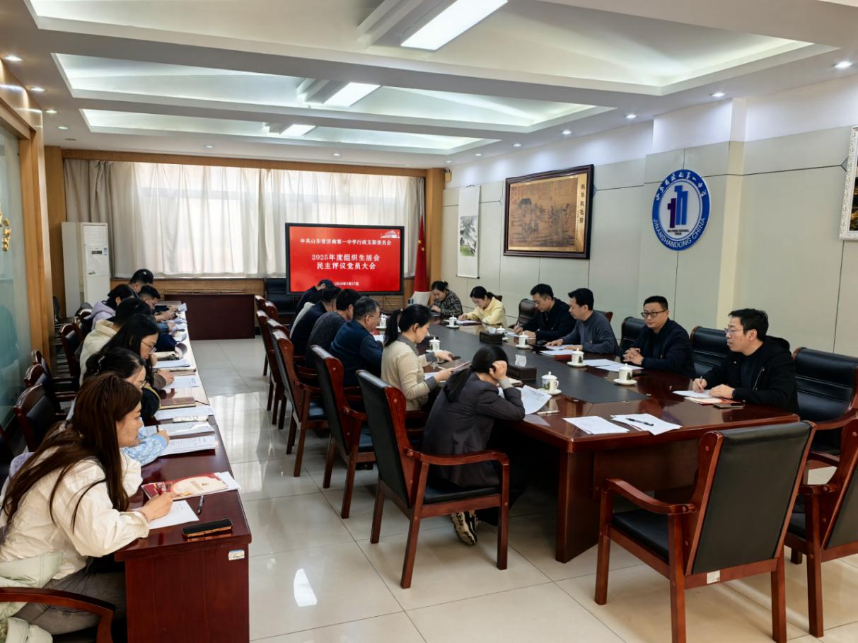 3月17日,济南一中行政党支部在弘德楼一楼会议室召开2025年度组织生活会暨民主评议党员会,党支部书记隋顺东主持。