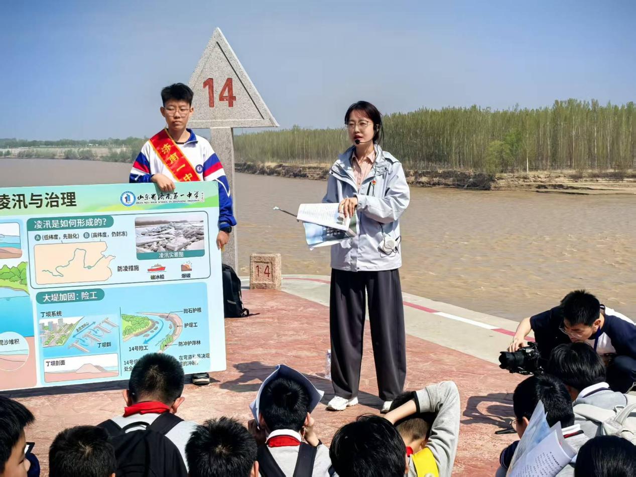 行至黄河14号坝、44号坝,一场生动有趣的行走地理课正式开讲。地理教师董克翠、张正方结合现场实景及教具,围绕黄河悬河形成、凌汛特点及治理措施,用通俗的语言、直观的讲解,为同学们揭开黄河地理奥秘,让课本上的地理知识变得鲜活可感。学生们在实践中理解人与自然和谐共生的重要意义。