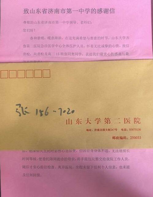 近日,山东大学齐鲁第二医院向济南一中发来感谢信,对高二15班张同奥同学拾金不昧的善举提出表扬。