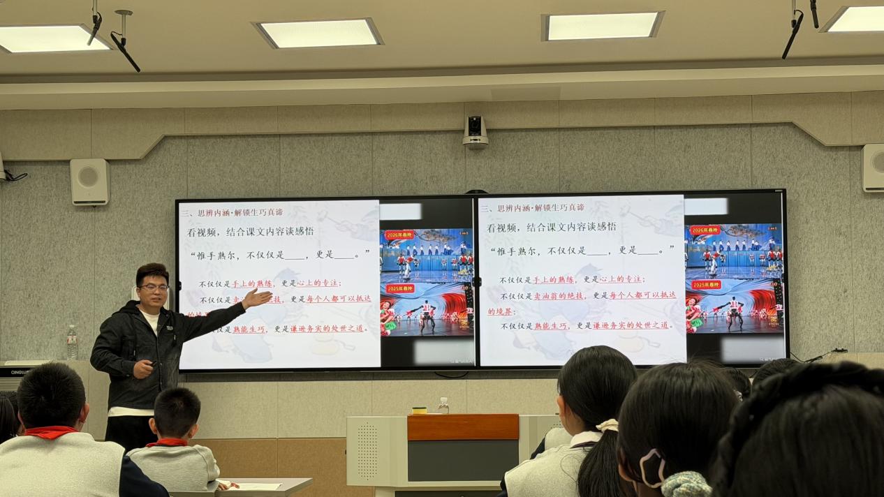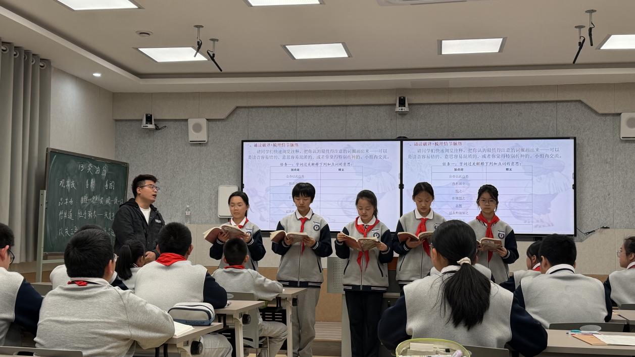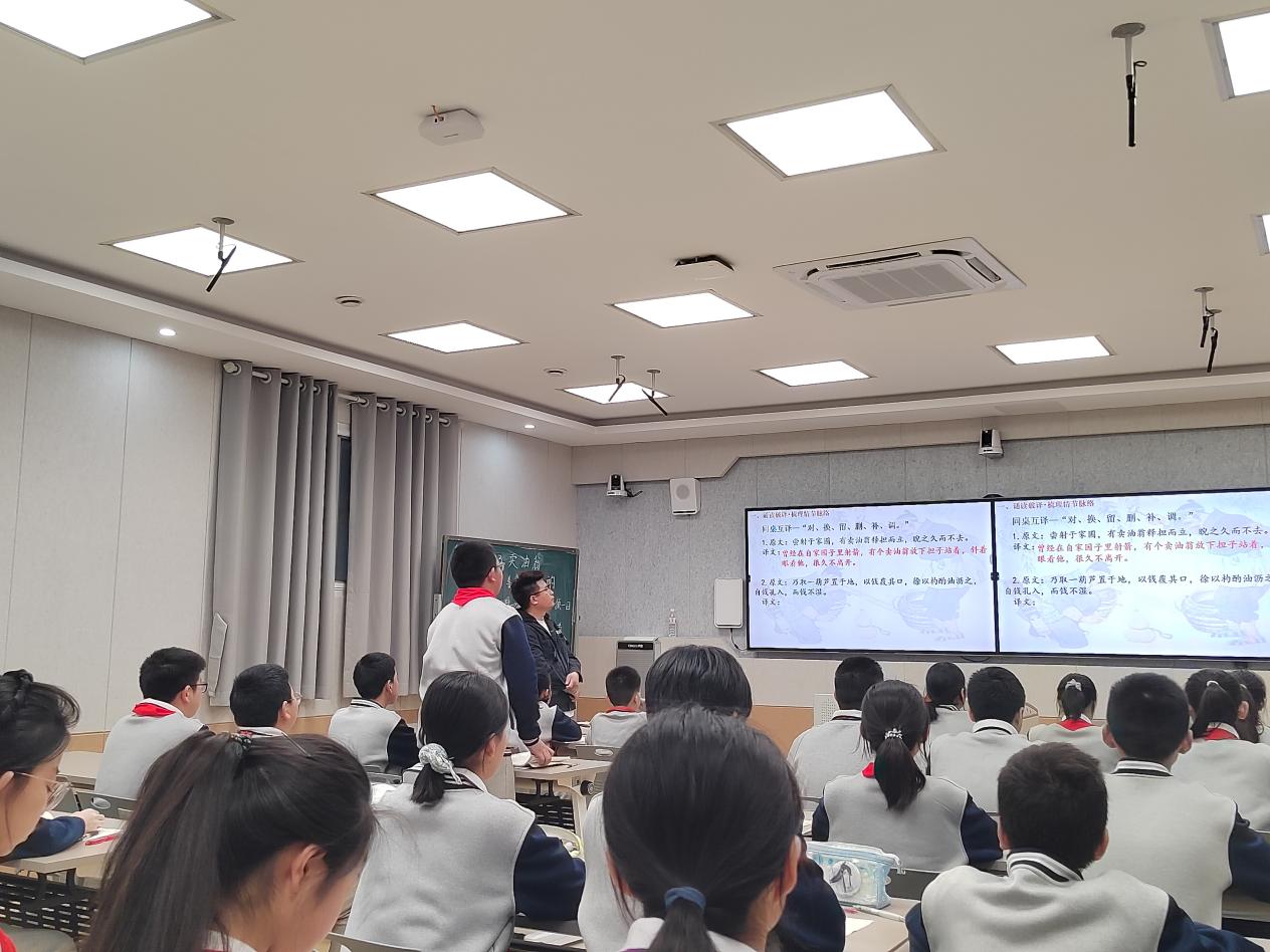 4月8日下午,初一(1)班语文教师曹圣猛在知新楼三楼录播室讲授展示课《卖油翁》。曹圣猛紧扣语文核心素养与“思政铸魂”理念,打破“教师主讲”的传统模式,构建学生互教、生生互助的生本课堂,以“观其技—品其言—悟其道”为主线,将文言教学、品德涵养与AI技术有机融合。课堂以“将军与老翁谁更厉害”的趣味问题激趣导入,通过范读、齐读、同桌互译、小组汇报等环节扎实落实文言基础,聚焦人物对比以分角色演读、AI画面赏析精准剖析形象,并围绕“惟手尔熟”展开深度思辨,自然生成“以技立身,以谦服人,以恒致远”的育人金句,实现了“熟能生巧、谦逊务实”的育人目标。学生主动思考表达,专注投入,展现出极高的参与度与语文素养。