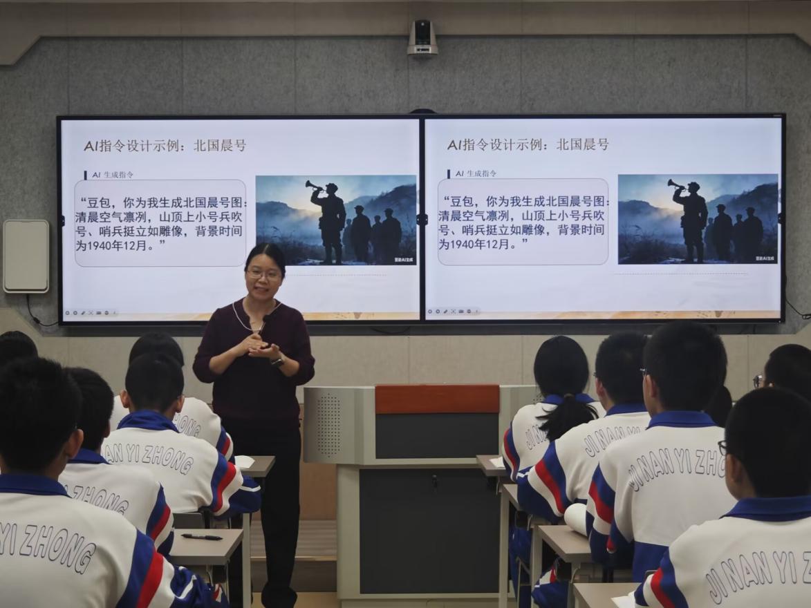 课堂以“绘苍茫地,写心中景”为诗意主线,层层铺展“绘风景——辨风景——悟风景”三大递进任务。陈婕将人工智能创新融入经典文本教学,引导学生亲手撰写AI绘图指令,把沙漠驼队、月夜归耕、延河夕照、石洞雨景、桃林小憩、北国晨号这六幅文学画卷一一具象化呈现。