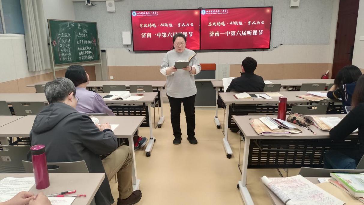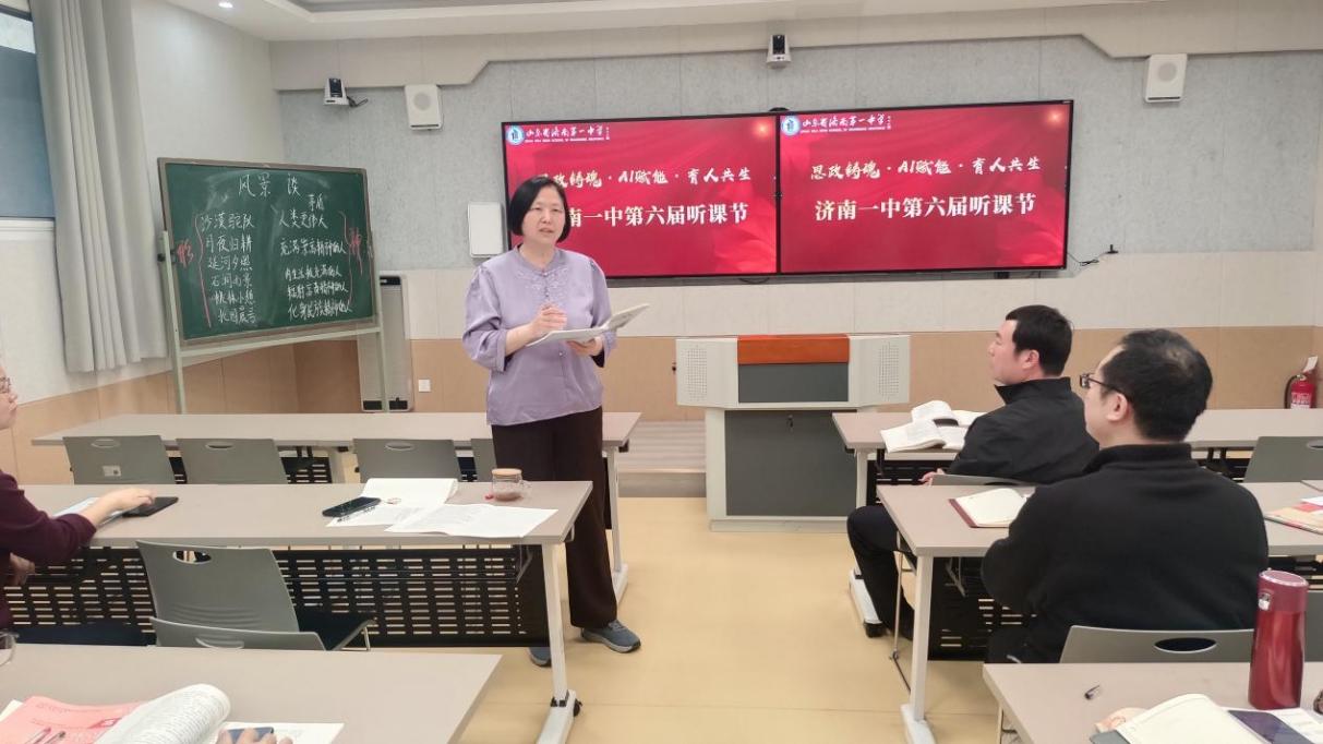 在评课环节中,语文教研组强艳老师表示,陈捷对《风景谈》这篇文章的挖掘较深,问题设置恰当,充分体现了语文教学在学生身心发展中的引领作用。高二备课组长贾倩倩围绕人工智能在课堂中的融合应用展开评析,认为AI技术的引入既拓展了学生的审美体验,又在不干扰文本深度解读的前提下,实现了技术与语文教学的自然衔接,为智慧课堂建设提供了有益探索。