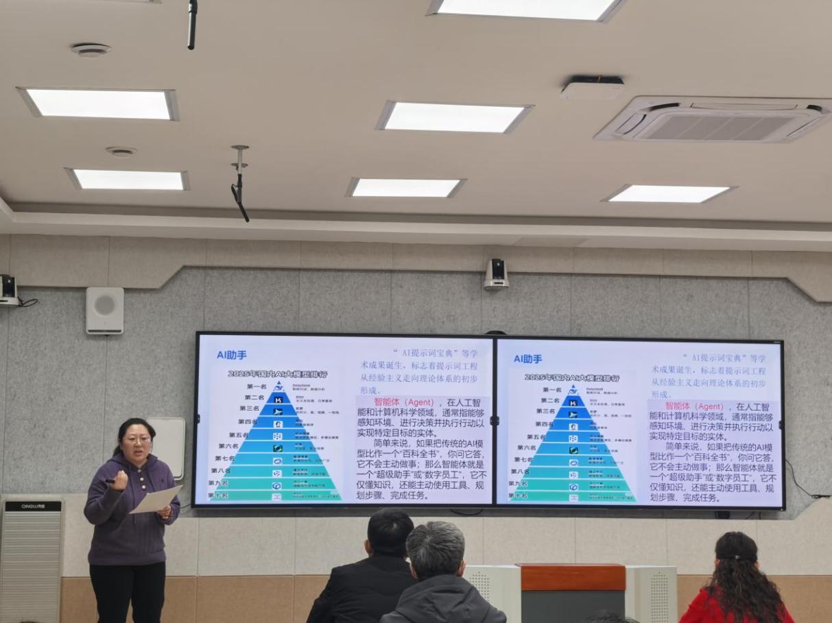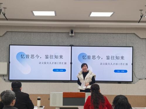 随后,语文组拔尖人才部负责人孙秀霞梳理归纳上学期语文组作文大赛的成果与经验;高三备课组长贾倩倩给大家带来了一堂AI赋能教育新生态的融合课——人机协同 智启新程,为语文组老师的新课堂提供了方法理论支撑。