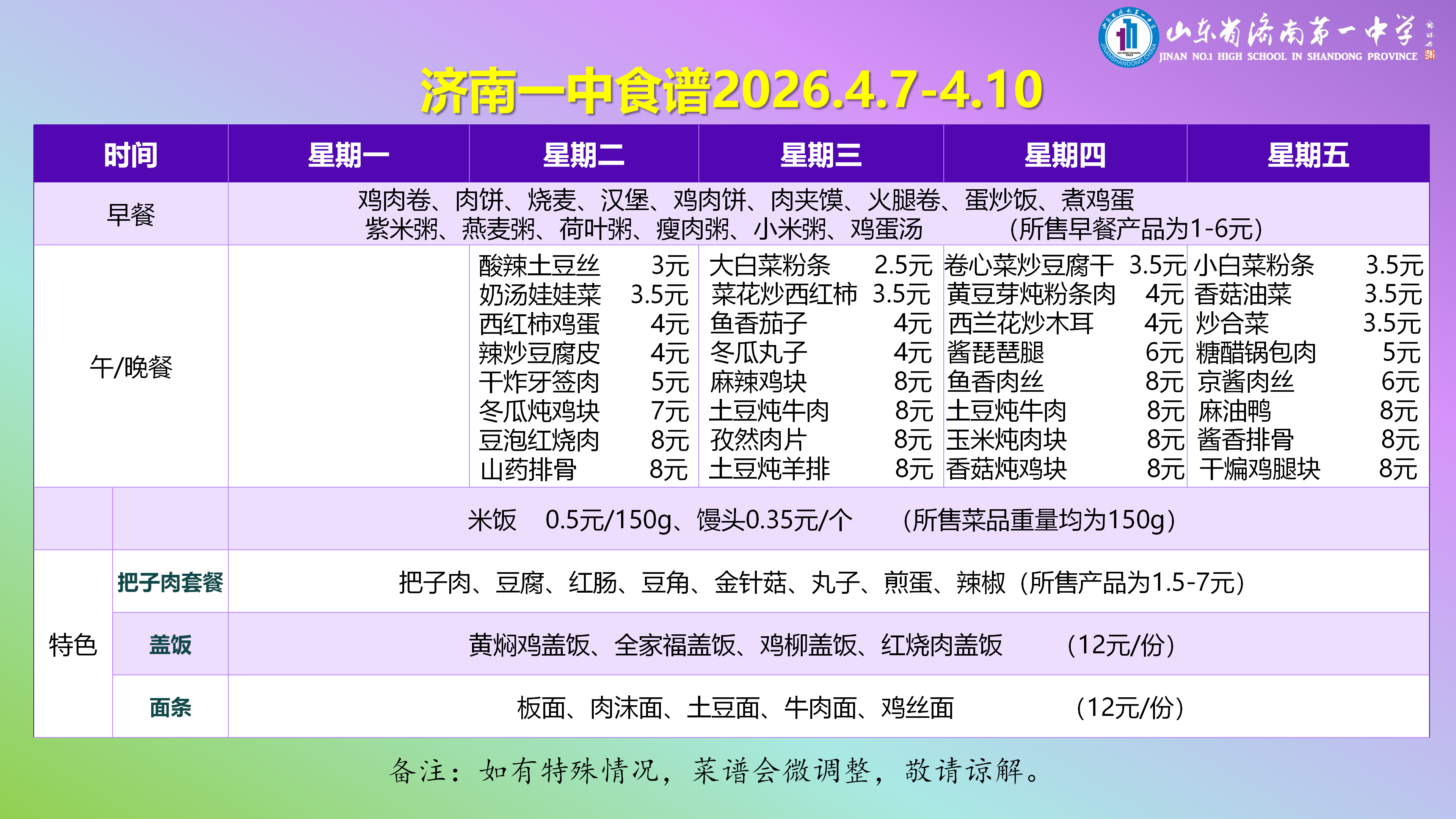 济南一中食谱2026.4.7-4.10