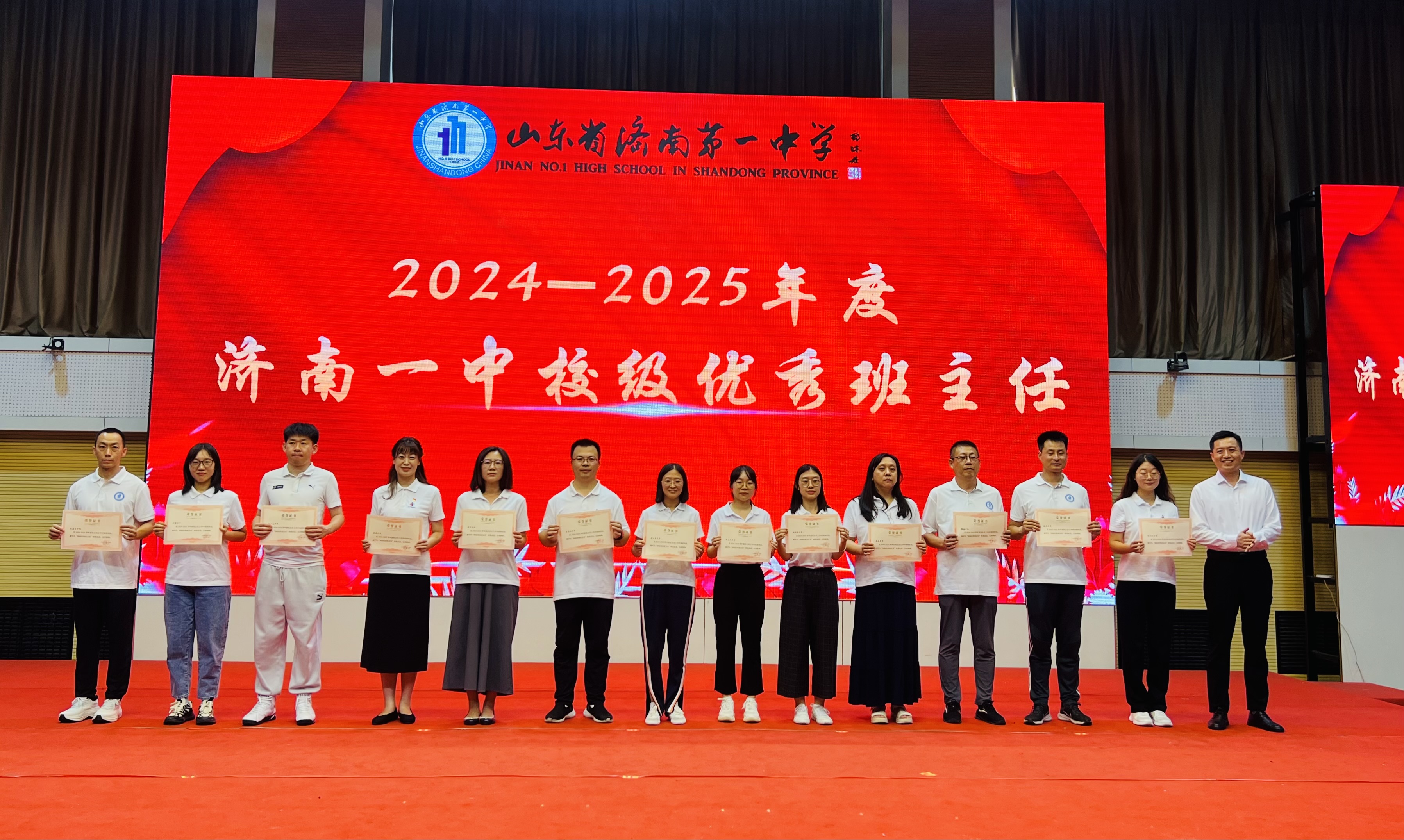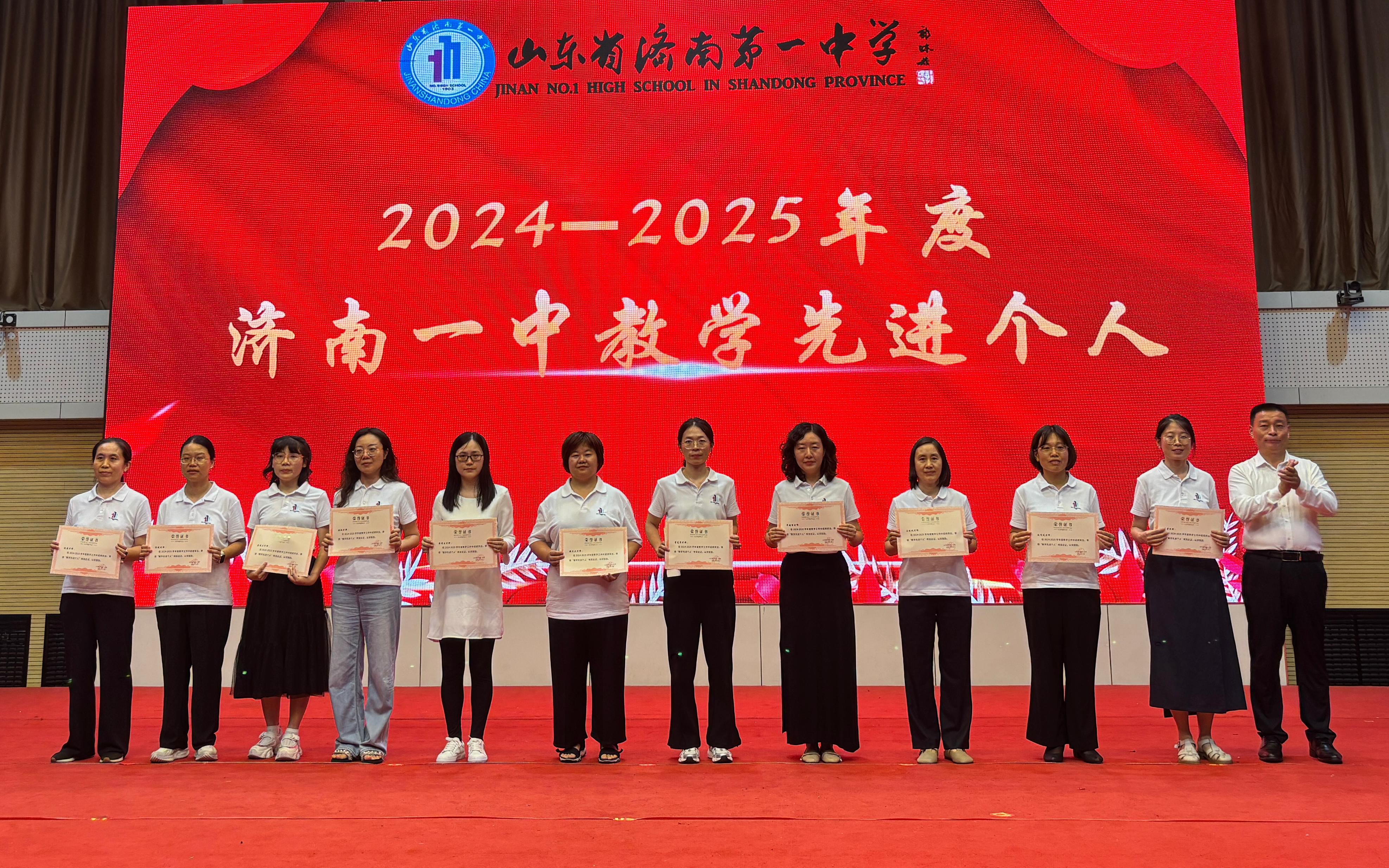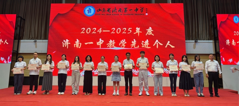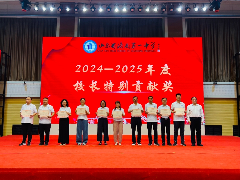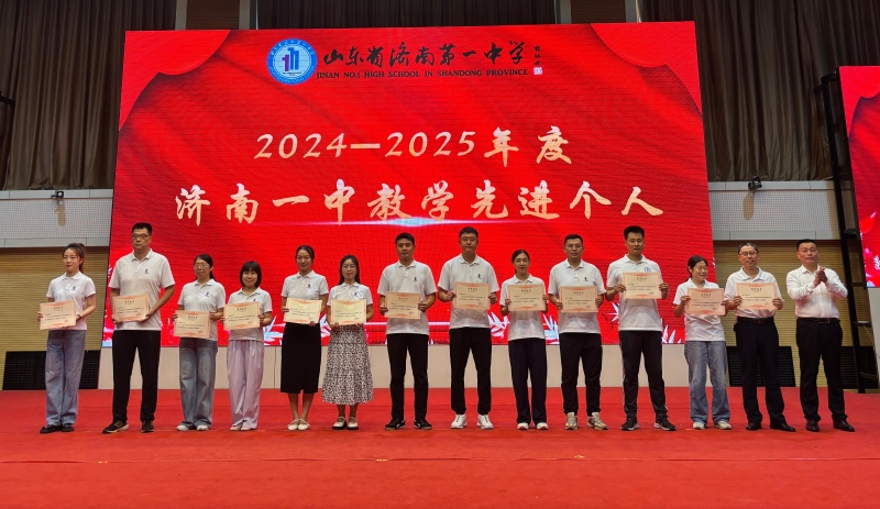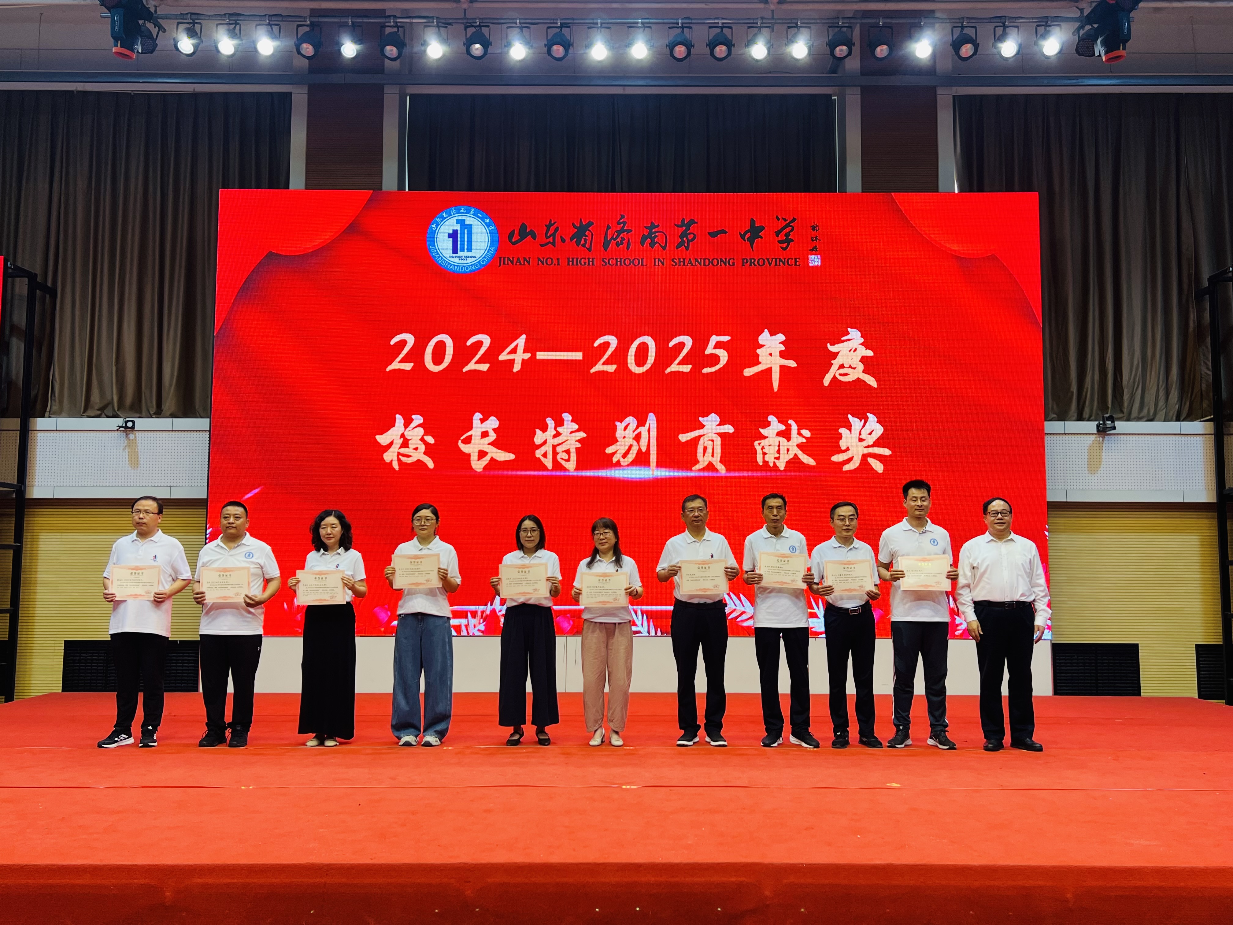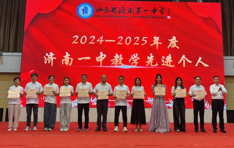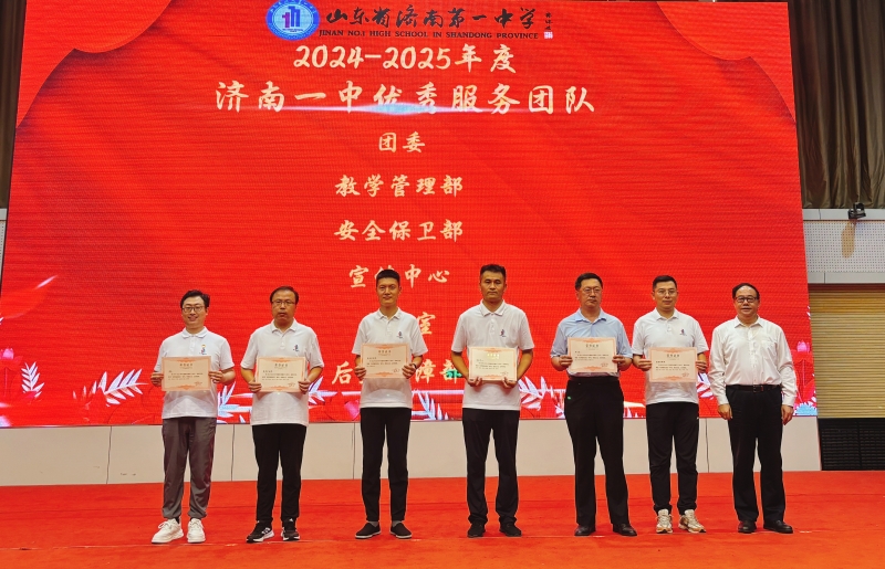 副校长高万福宣读《济南一中2024-2025学年度表彰决定》,学校领导依次为“优秀服务团队”“优秀教学团队”“教学先进个人”“校级优秀班主任”及“校长特别贡献奖”的获奖集体和个人颁发荣誉证书。