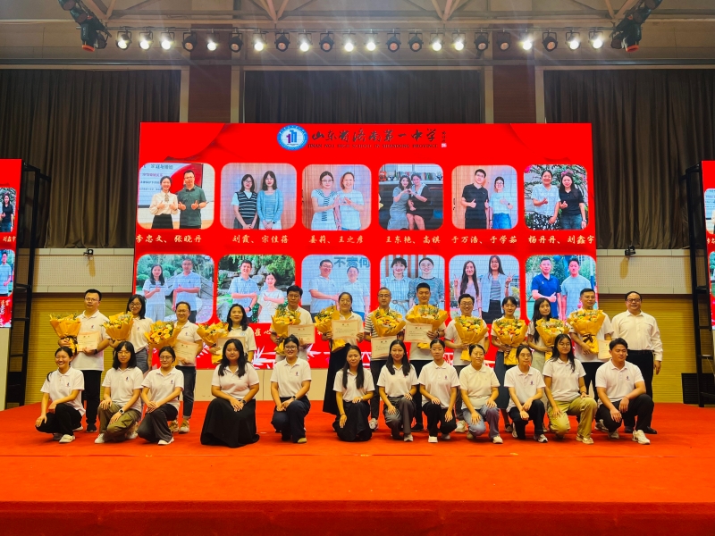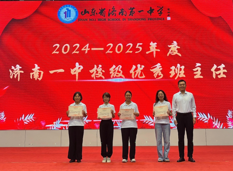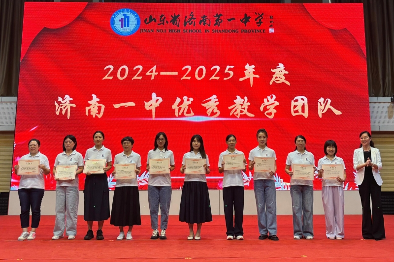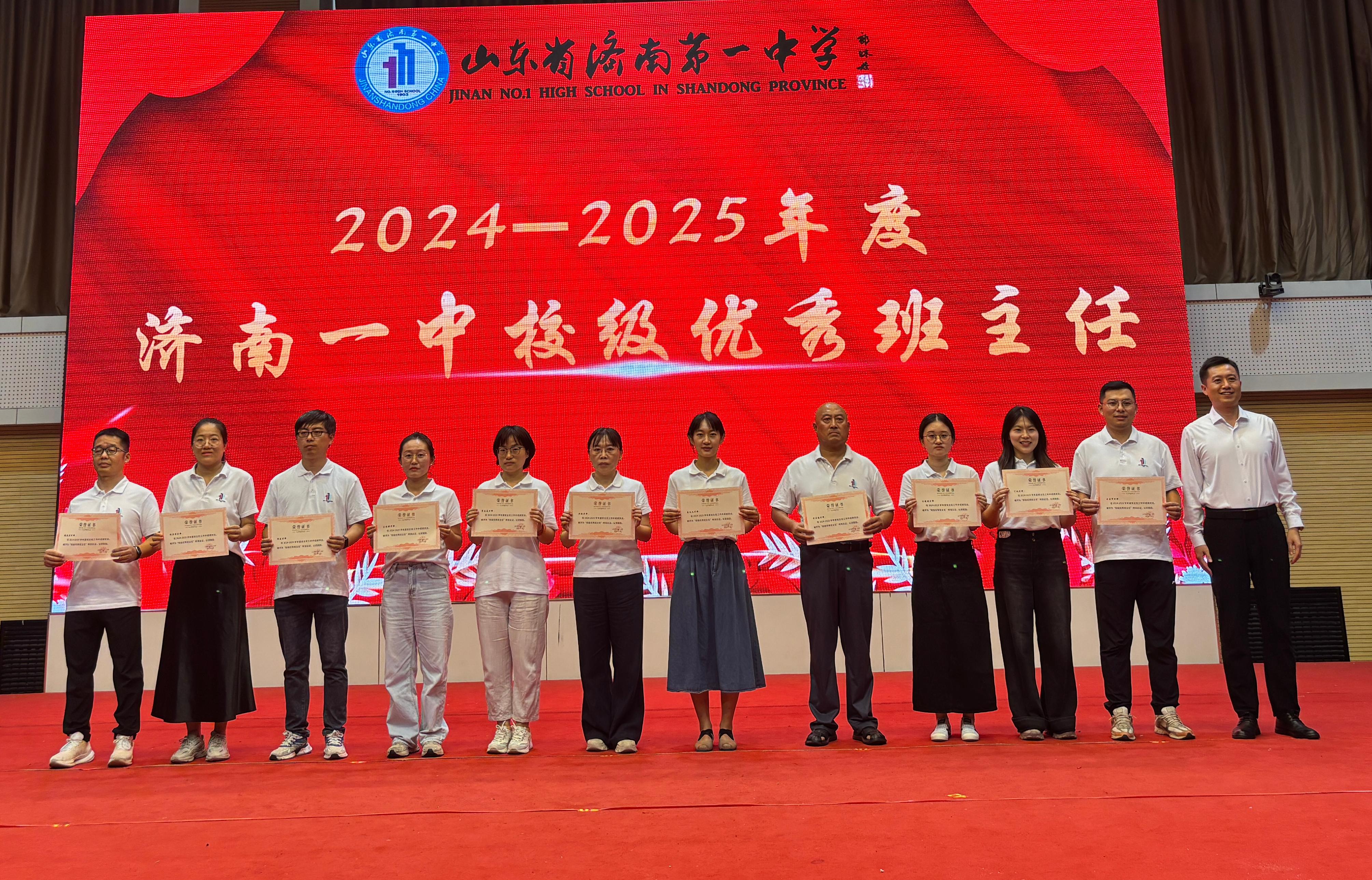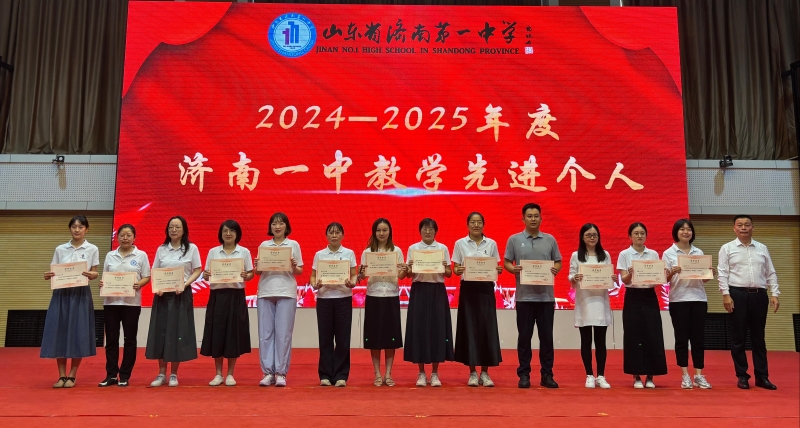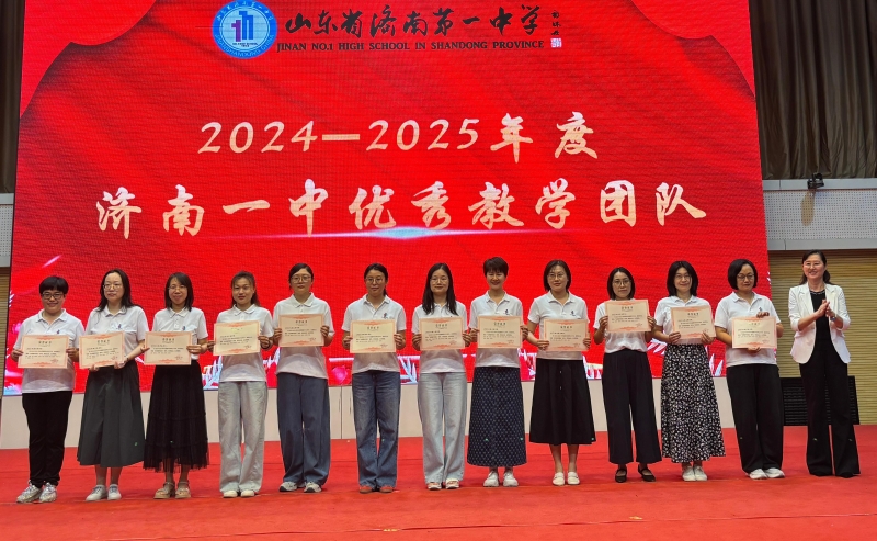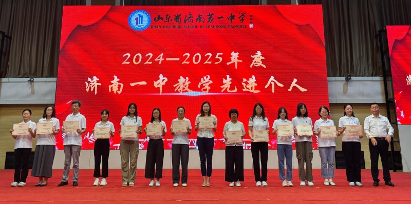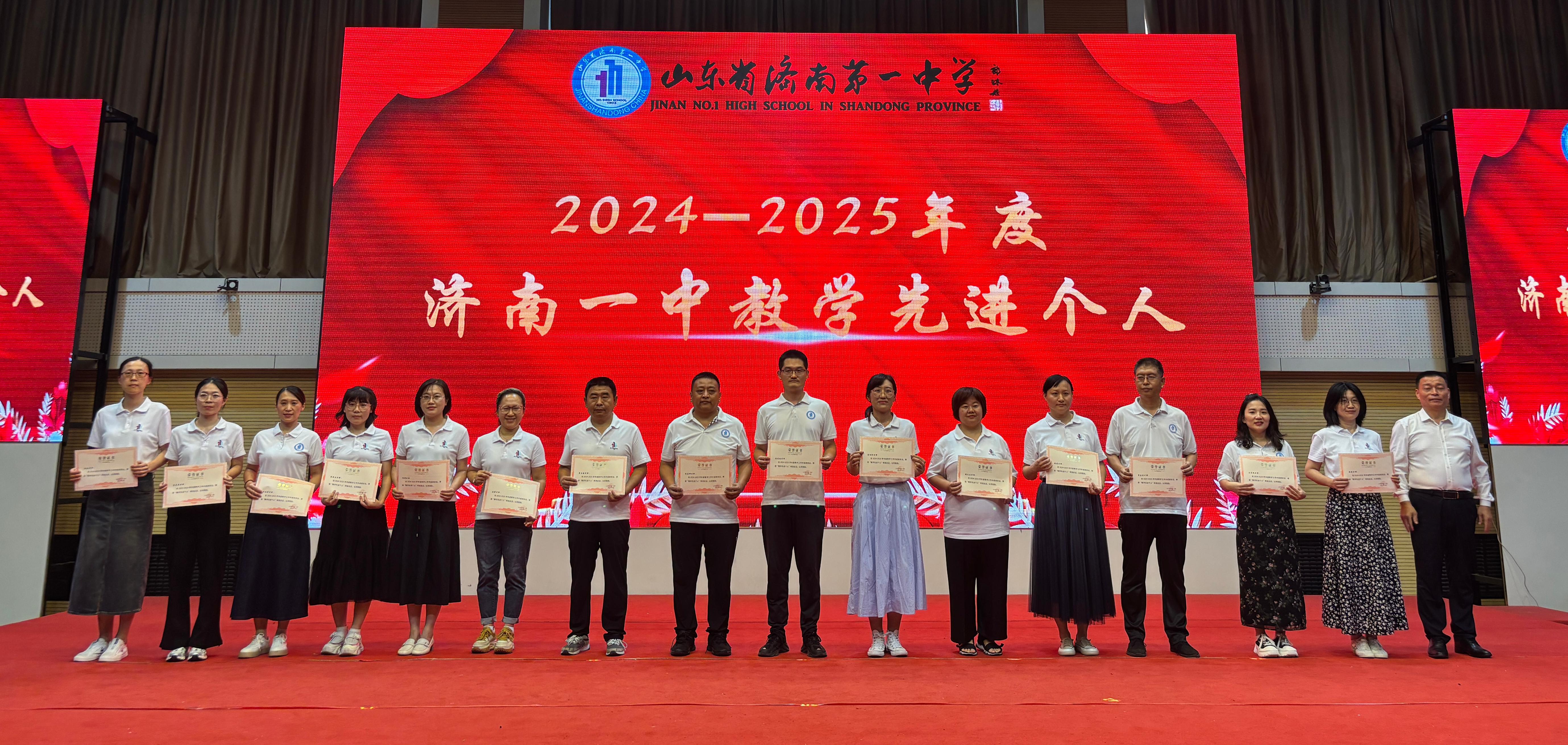 副校长高万福宣读《济南一中2024-2025学年度表彰决定》,学校领导依次为“优秀服务团队”“优秀教学团队”“教学先进个人”“校级优秀班主任”及“校长特别贡献奖”的获奖集体和个人颁发荣誉证书。