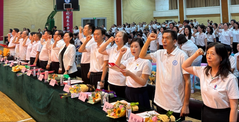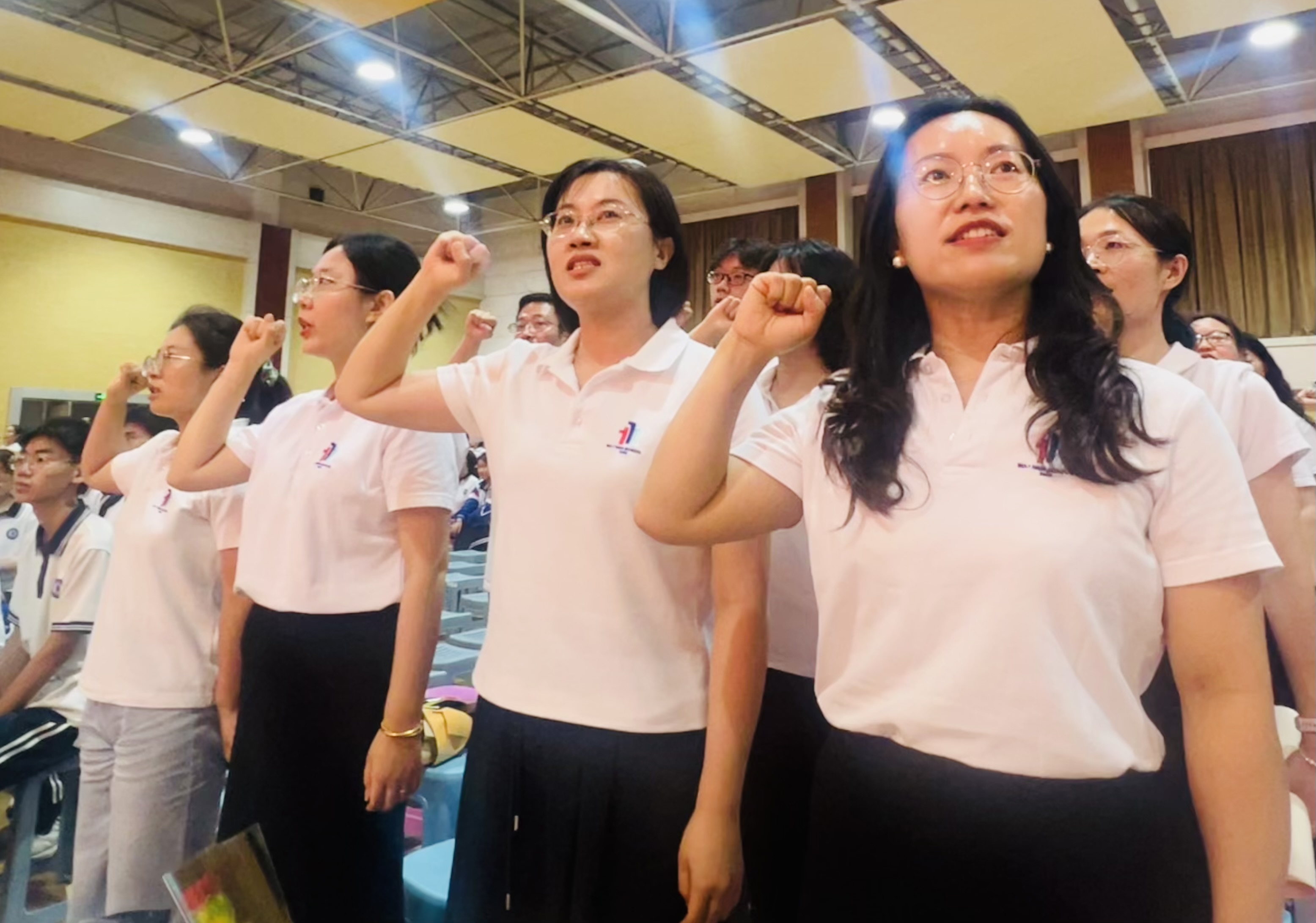 大会在教师集体宣誓中迎来尾声。宣誓环节由高万福领誓,全体教师高举右拳,面向国旗,郑重宣誓:“忠诚党的教育事业......为教育发展、国家繁荣和民族复兴而努力奋斗!”誓言回荡在会场,彰显了一中教师不忘立德树人初心、勇担育人使命的决心。