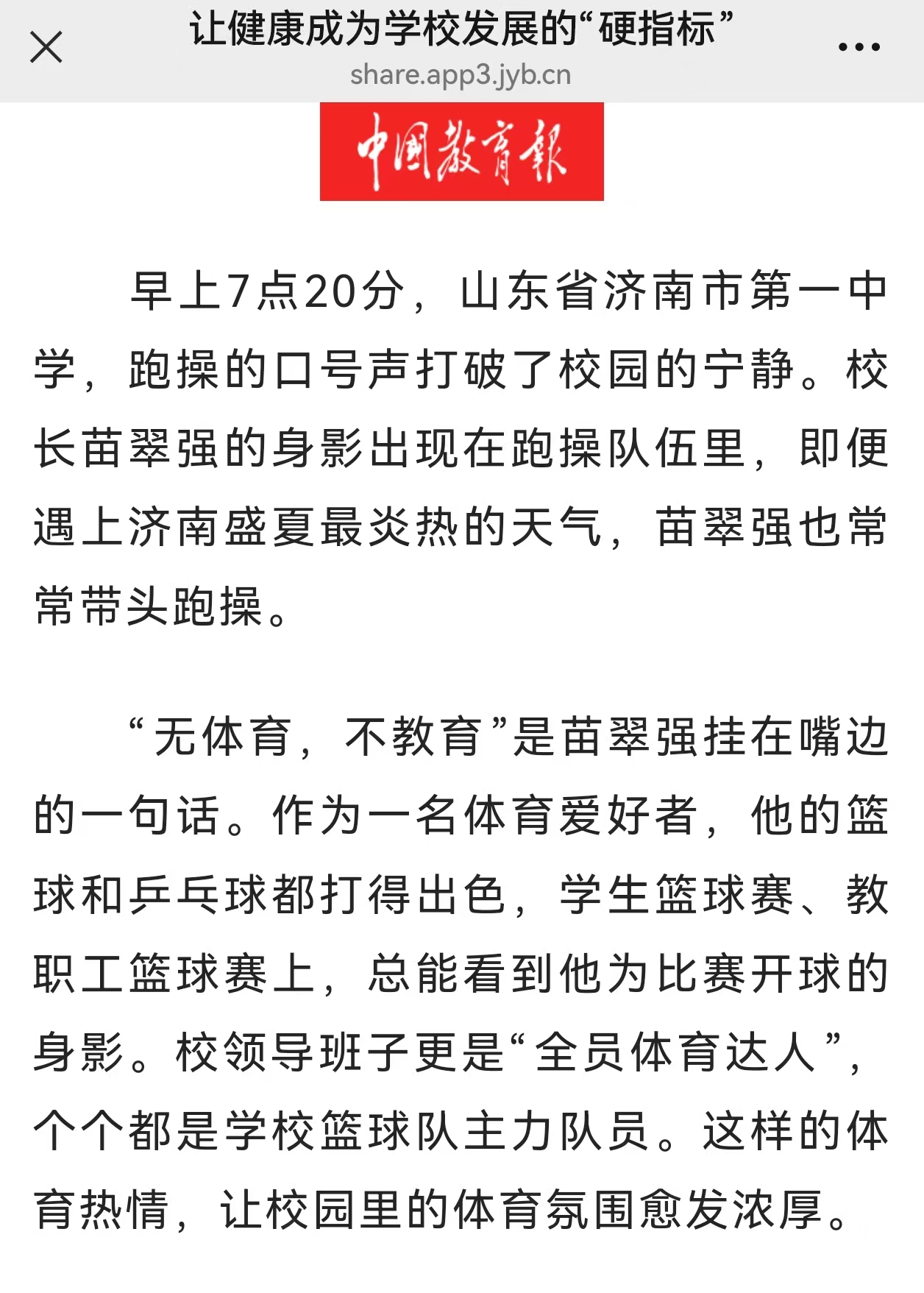 5.《中国教育报》头版以《让健康成为学校发展的“硬指标”》为题报道济南一中推进五育并举、促进学生体质健康的扎实举措和生动实践。男子足球队获山东省校园足球协会杯青少年精英赛冠军;男子排球队获山东省沙滩排球锦标赛冠军。高中部辛志淼、马祥瑞、姜涵策入选国家队,参加了2025年亚青会沙排项目。