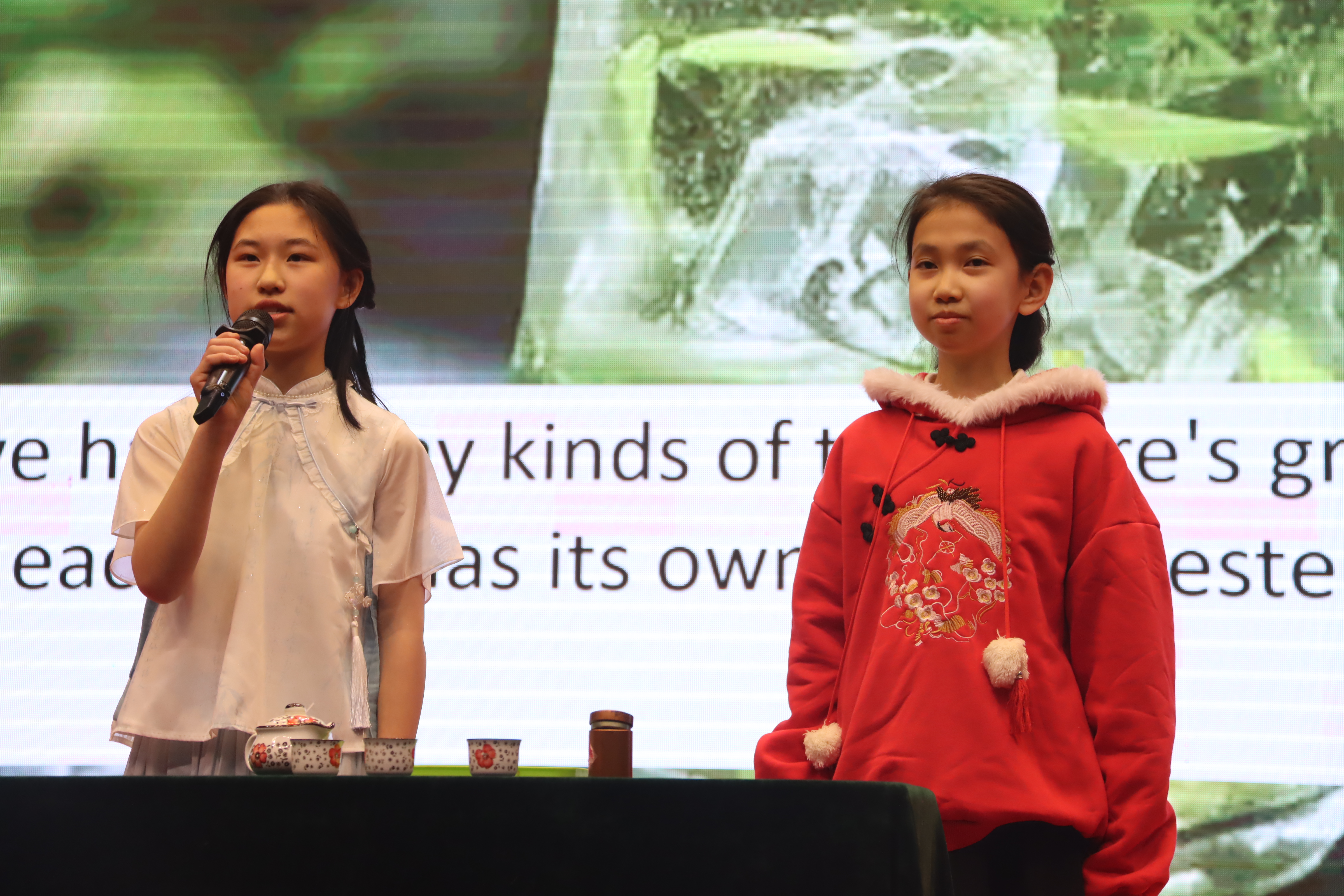 演讲环节中,各组选手紧扣主题,尽显青春风采。初二 3 班陈锦瑶以 “泉城济南” 为主题,用流畅的英语生动讲述家乡的秀美风光与特色美食,情感真挚动人;初二 1 班曹璟悦、海硕以英文朗诵经典词作《沁园春・雪》,将中华诗词的雄浑豪迈展现得淋漓尽致;初一 2 班刘书晴、赵艺帆深入解读中国茶文化,展现中西文化交融之美。