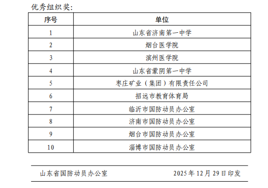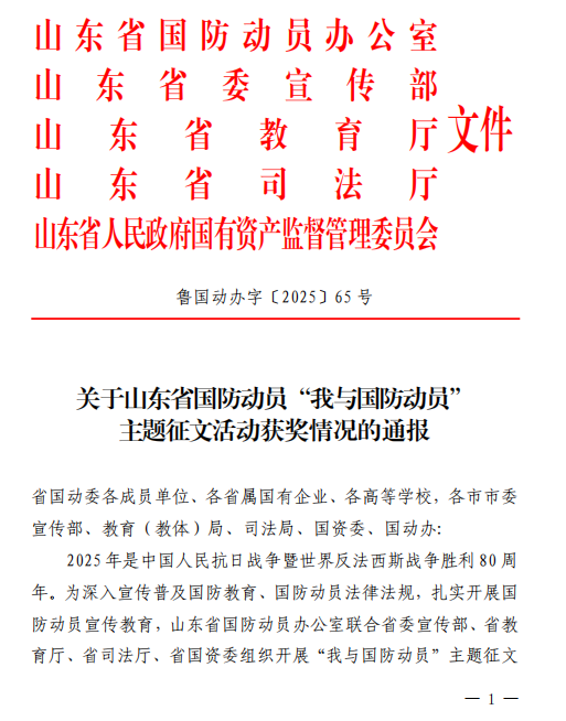 近日,山东省国防动员办公室联合省委宣传部、省教育厅、省司法厅、省国资委发布《关于山东省国防动员“我与国防动员”主题征文活动获奖情况的通报》。山东省济南第一中学凭借扎实的组织工作与丰硕的活动成果,成功荣获“优秀组织奖”。