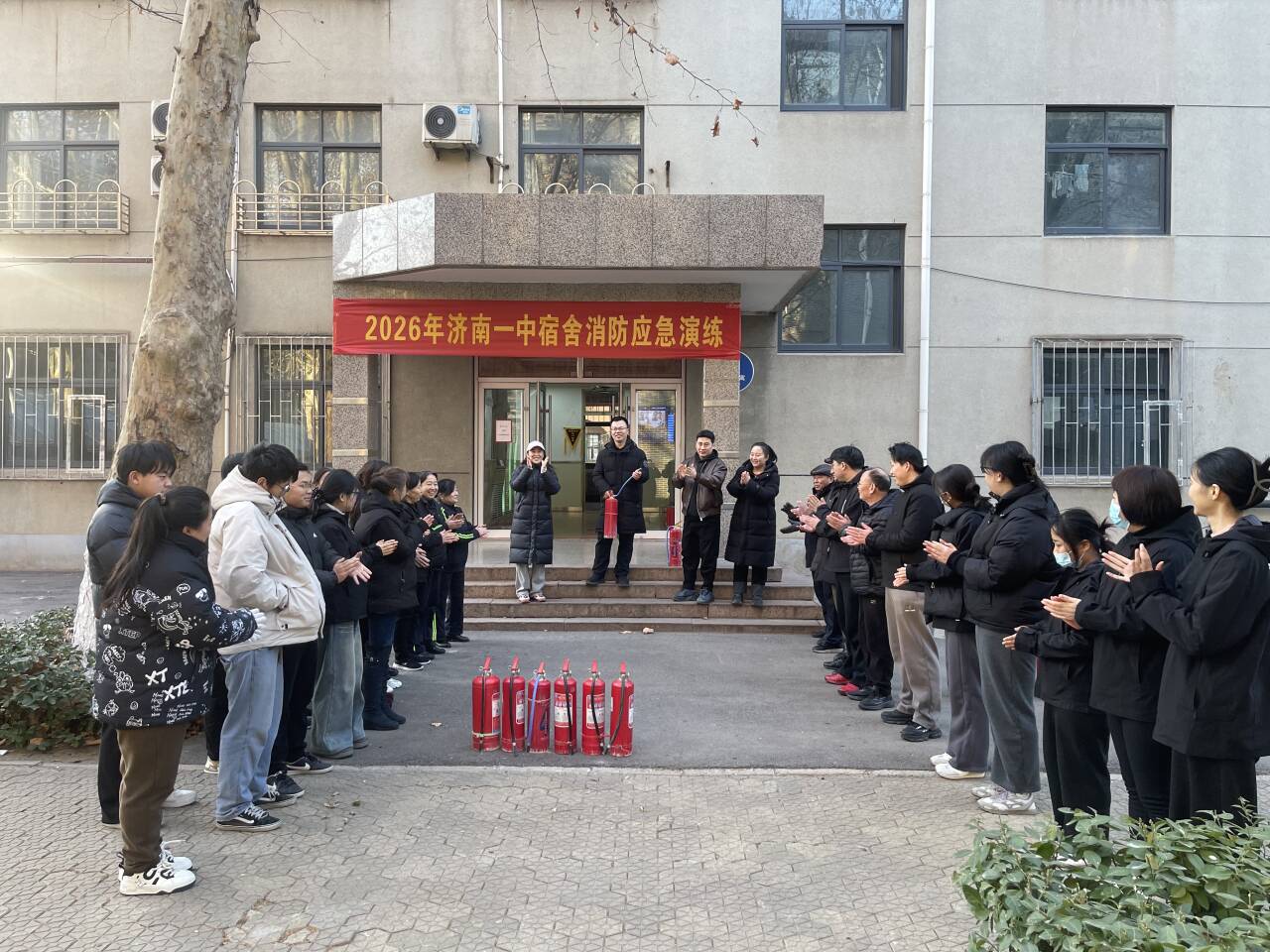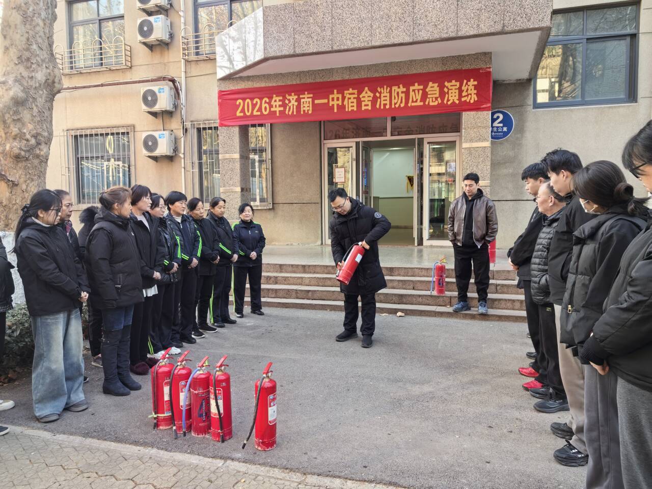 1月7日,济南一中开展宿舍消防应急演练,生活指导科科长李忠文主持,安全保卫部主任张鹏,全体生活指导老师参加。