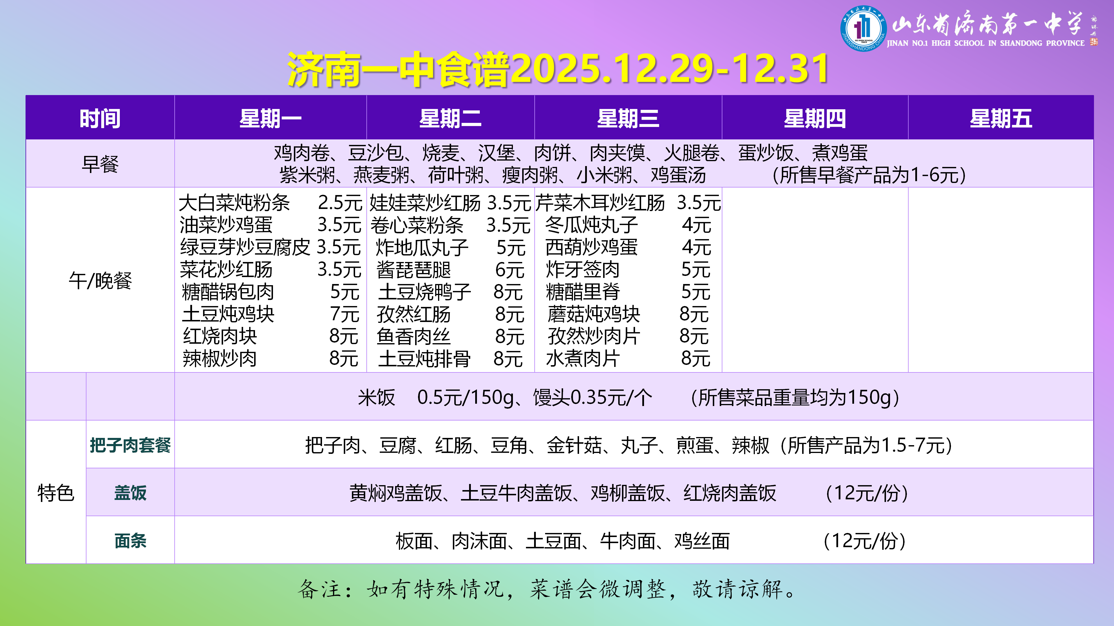 济南一中食谱2025.12.29-12.31