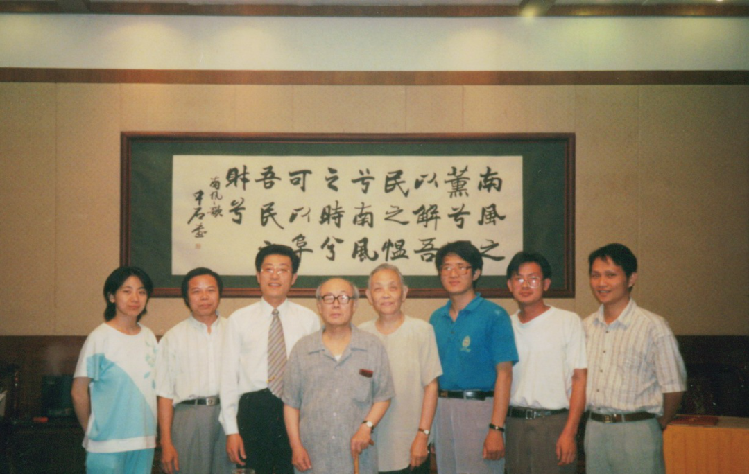 1999年与欧阳中石先生、张茝京先生及中国首届书法文化专业博士研究生在济南。从左至右为:解小青、黎东明、邹卫平、欧阳中石、张茝京、郑晓华、甘中流、叶培贵。