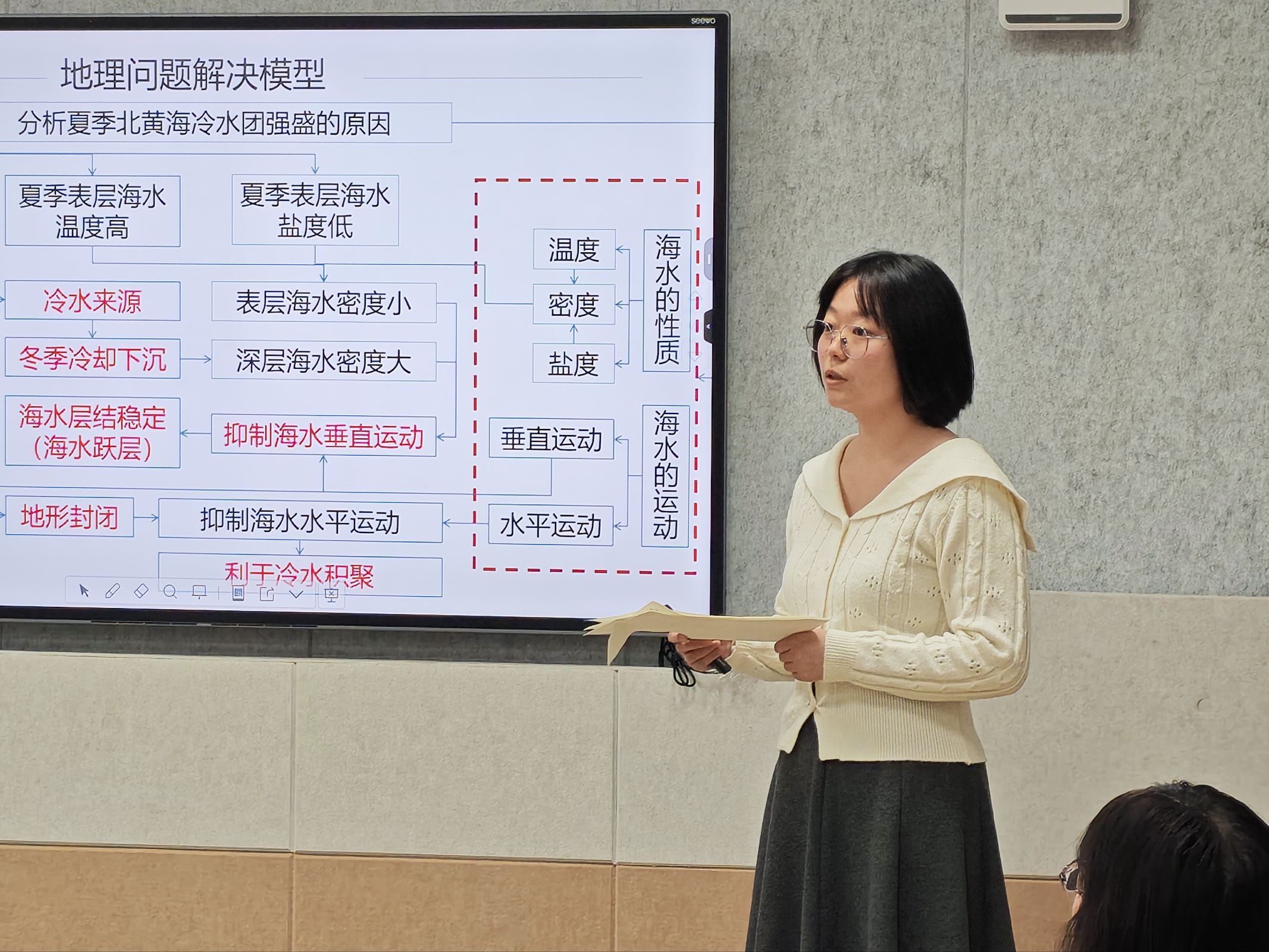 高三地理组葛悦团队以“北黄海冷水团”为背景,通过创设认知冲突,考查学生信息提取与知识迁移能力,并融入国家安全教育。分享后,高一、高二教师围绕材料选用与答案科学性展开探讨,高三教师细致解答。