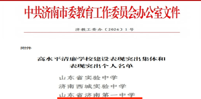 近日,济南市高水平清廉学校建设评选结果公布,济南一中凭借扎实的建设成效、鲜明的育人特色,获评全市“高水平清廉学校建设表现突出集体”。