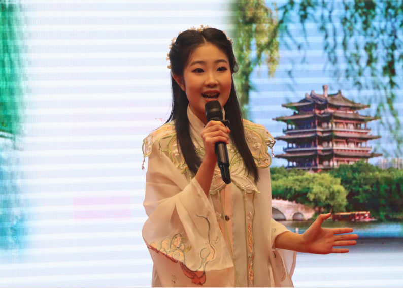 演讲环节中,各组选手紧扣主题,尽显青春风采。初二 3 班陈锦瑶以 “泉城济南” 为主题,用流畅的英语生动讲述家乡的秀美风光与特色美食,情感真挚动人;初二 1 班曹璟悦、海硕以英文朗诵经典词作《沁园春・雪》,将中华诗词的雄浑豪迈展现得淋漓尽致;初一 2 班刘书晴、赵艺帆深入解读中国茶文化,展现中西文化交融之美。