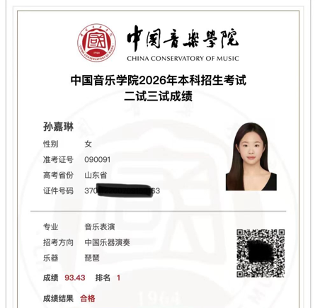 近日,济南一中2023级音乐特长生孙嘉琳同学在中国音乐学院2026年艺术类本科招生校考中表现突出,以二试、三试成绩均位列第一的优异表现,展现了济南一中艺术教育的丰硕成果。