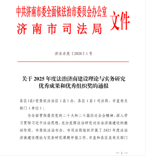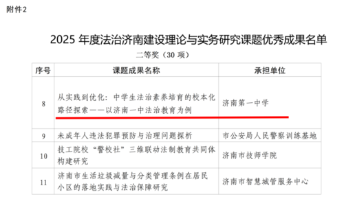 近日,中共济南市委全面依法治市委员会办公室、济南市司法局联合公布2025年度法治济南建设理论与实务研究课题评审结果。济南一中报送的课题,经专家评审、结项验收,从193项研究课题中脱颖而出,荣获优秀成果二等奖。